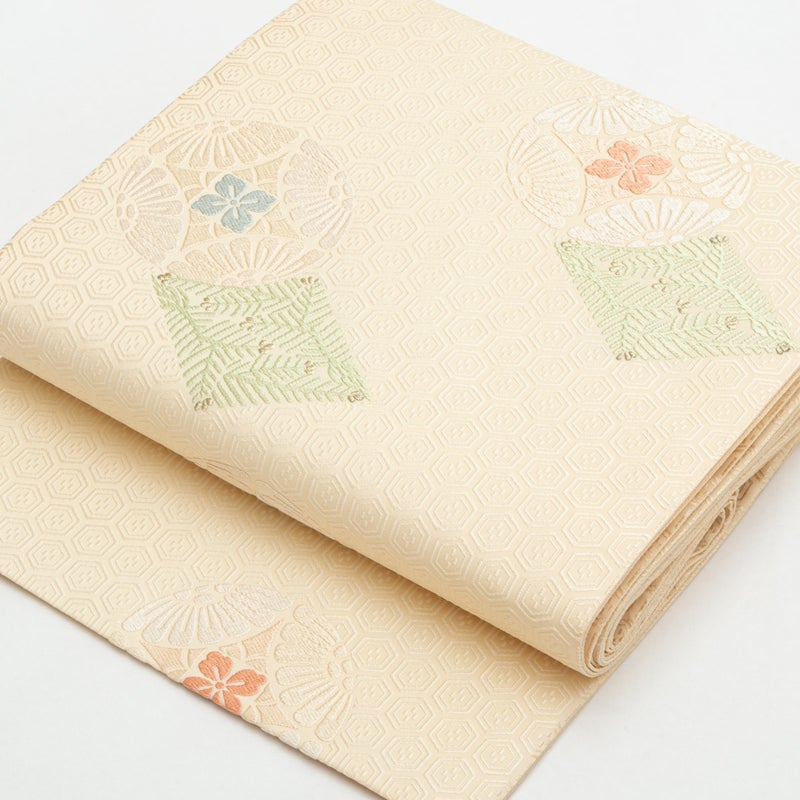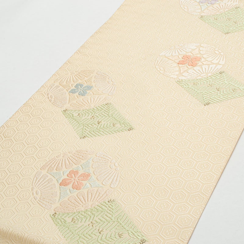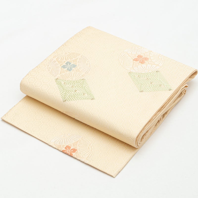 袋帯 唐織 七宝丸文 松葉菱 クリーム 西陣織 正絹 礼装用です。