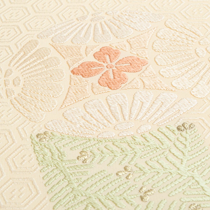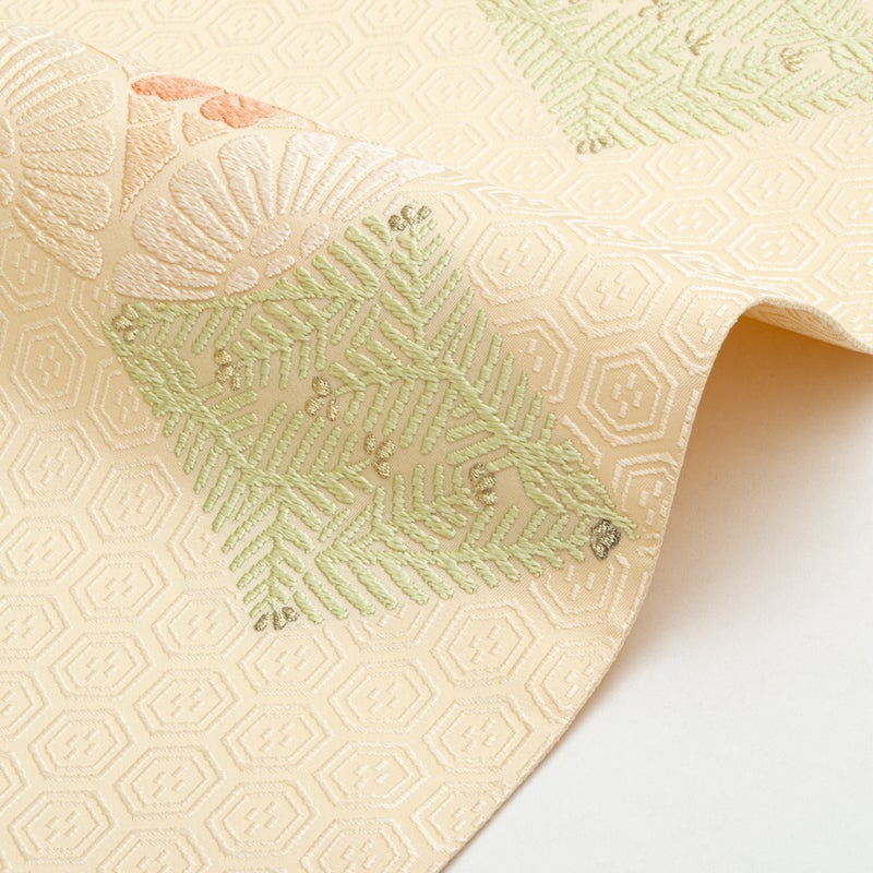 亀甲調の地紋の上に、菊や草花をあしらった丸文と松葉菱がやさしい配色で浮かび上がり、控えめながらも品のある華やぎを添えています。