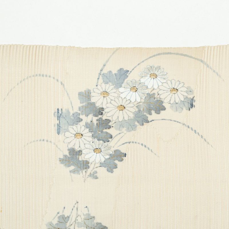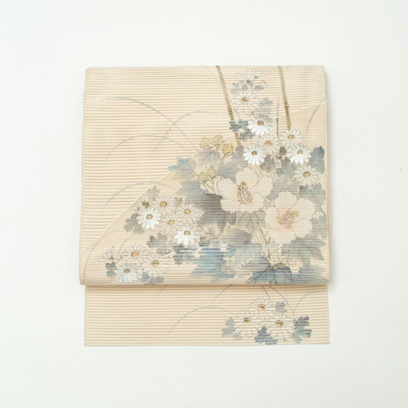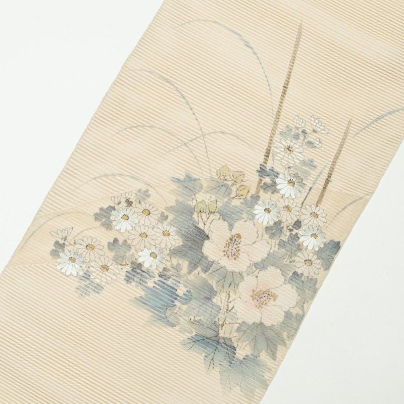 淡いライトベージュ地に、芙蓉と菊の花々が繊細に描かれた開き名古屋帯です。
