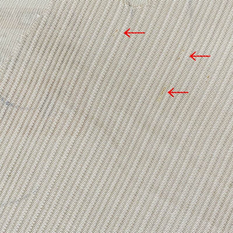 ・関東巻きで巻いたときの前柄の脇に薄い小さなシミが見られます(画像参照)。関西巻で巻けば隠れる部分です。凝視しなければ見つけられないレベルで、まったく目立つものではございません。