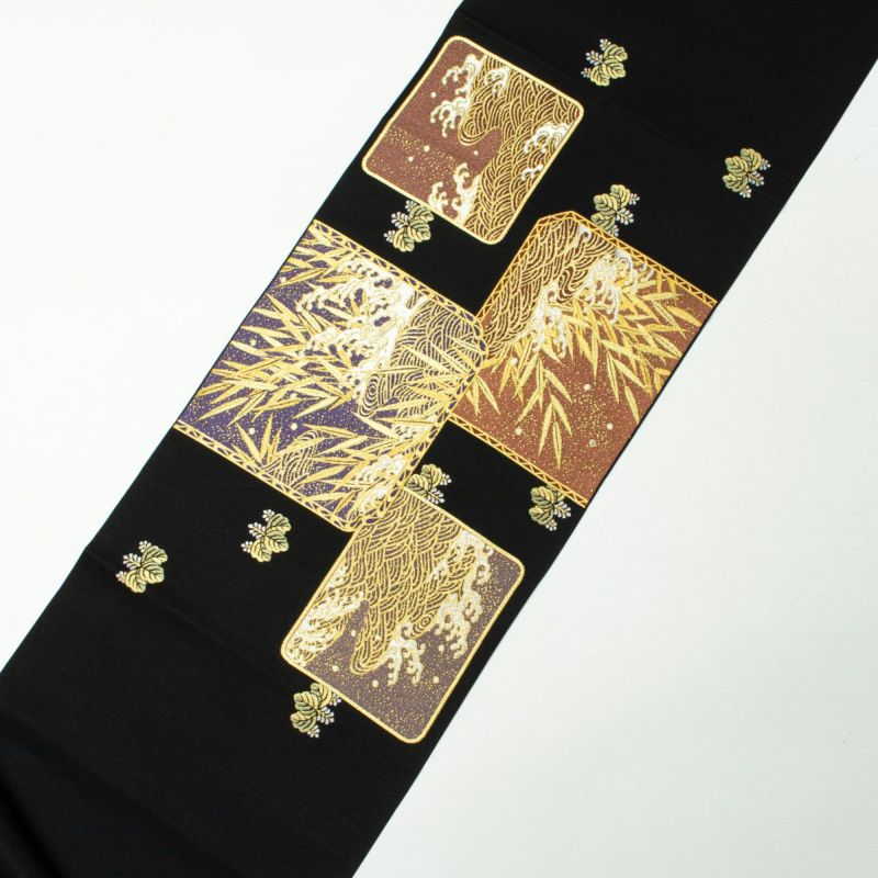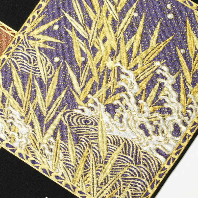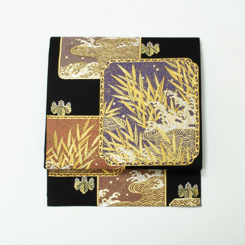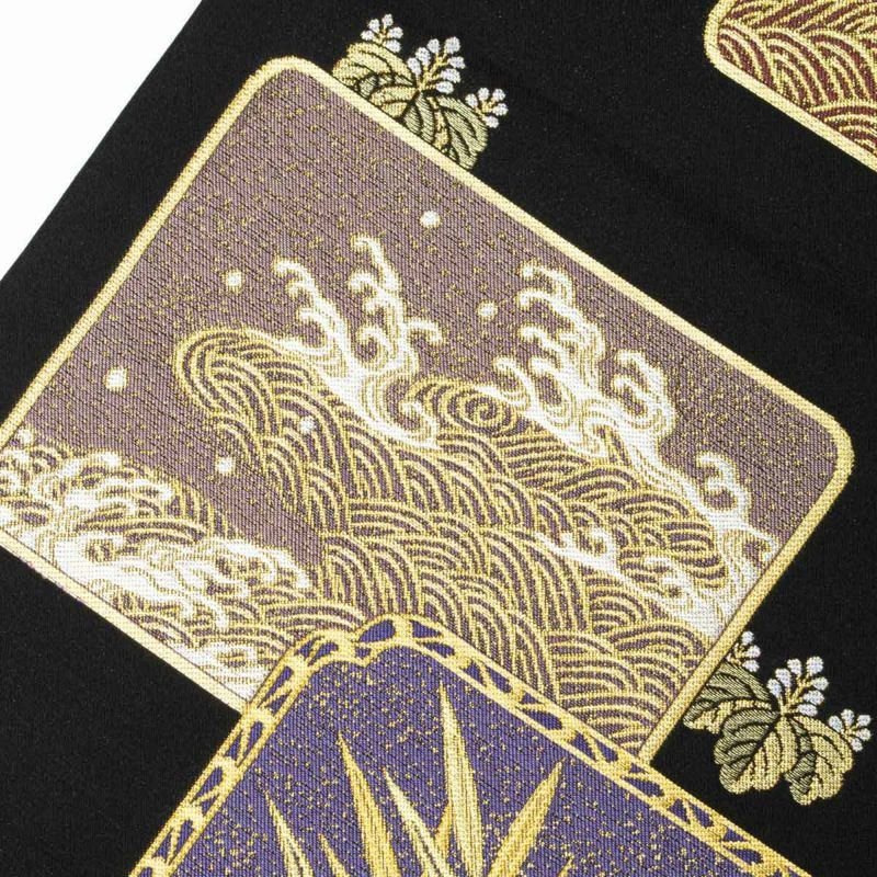 深みのある黒地に、金糸をふんだんに用いた青海波文様と、躍動感ある波文、そして瑞々しい植物文が繊細に織り出されています。