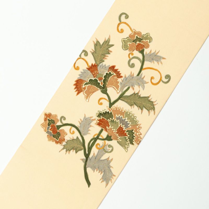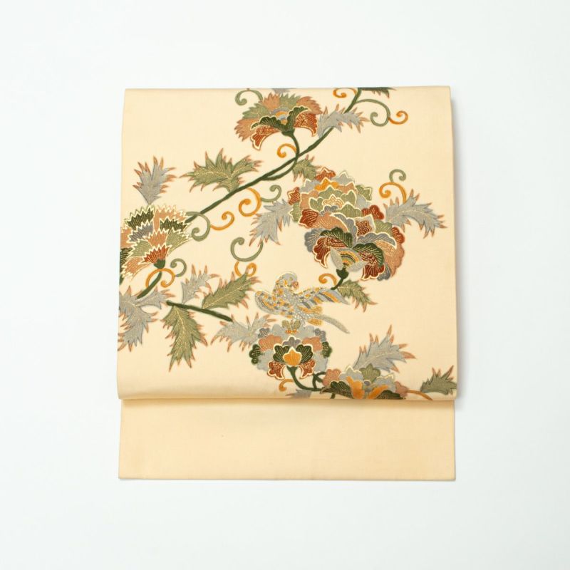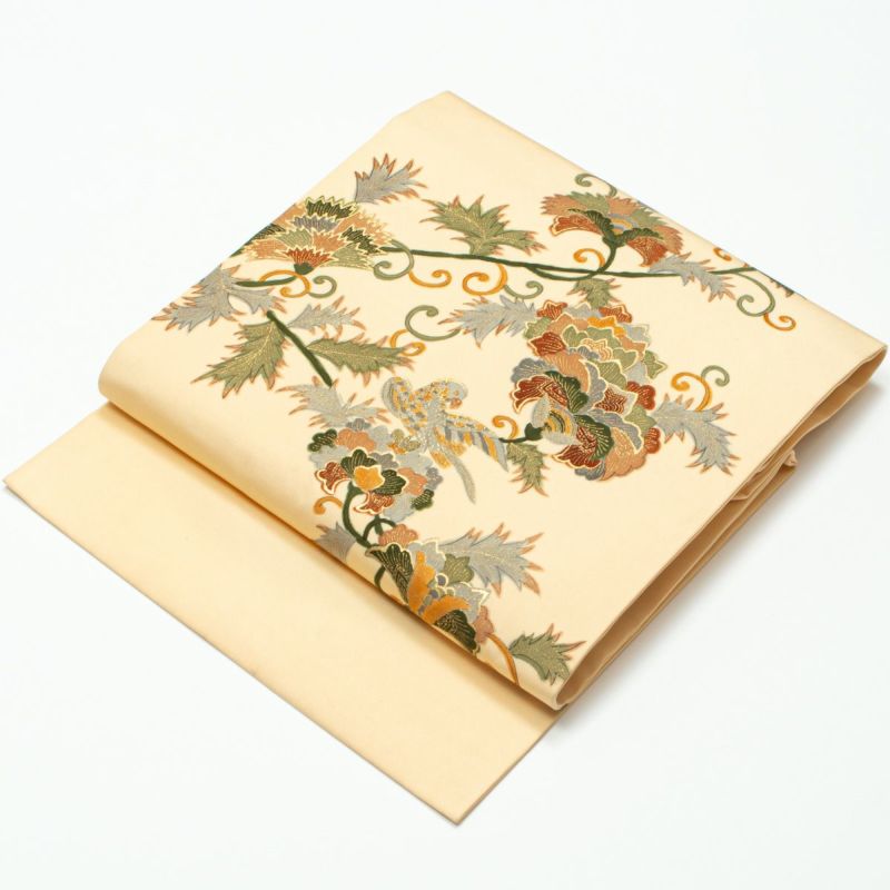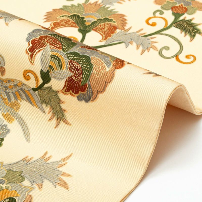滑らかな手触りの塩瀬地に手描きで描かれた、優美な唐花文と瑞鳥の意匠が印象的な九寸名古屋帯です。