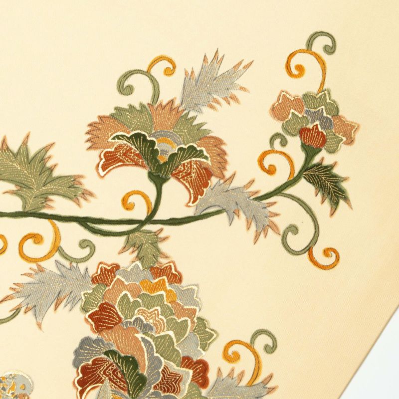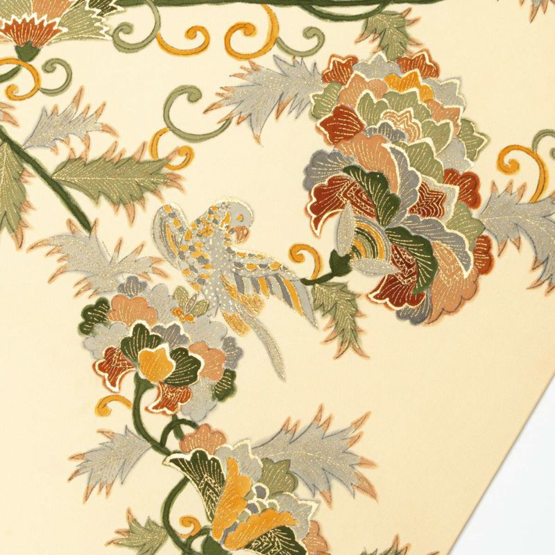 唐花文と瑞鳥は、豊かさや吉祥を象徴する古典意匠。お召しになる方の品格を引き立てながら、装いに静かな華やかさをもたらしてくれます。