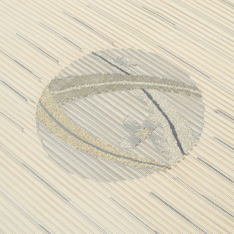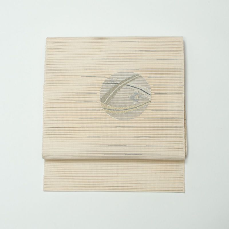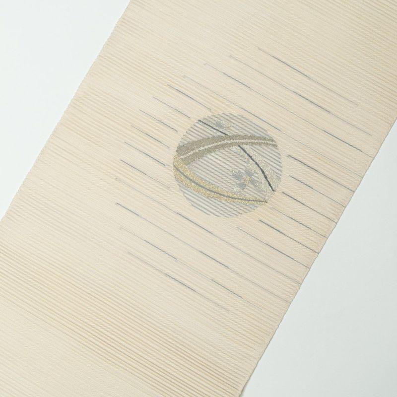 淡いアイボリーの地に、水平に流れるようなすくい織のラインが涼やかに広がり、丸文の中にはそよ風に揺れる草花が描かれています。