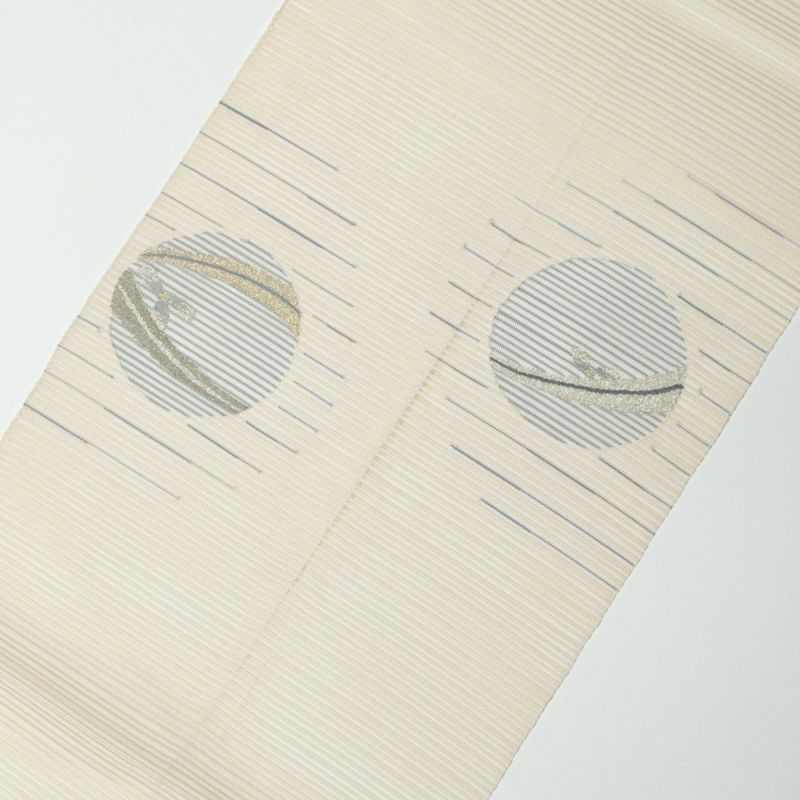 繊細な銀糸で織り出された植物文様が、丸文の中にそっと浮かび上がる上品な夏帯です。