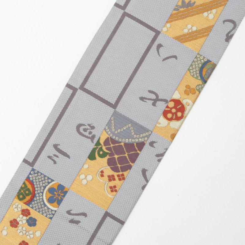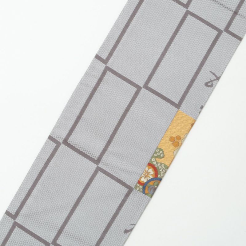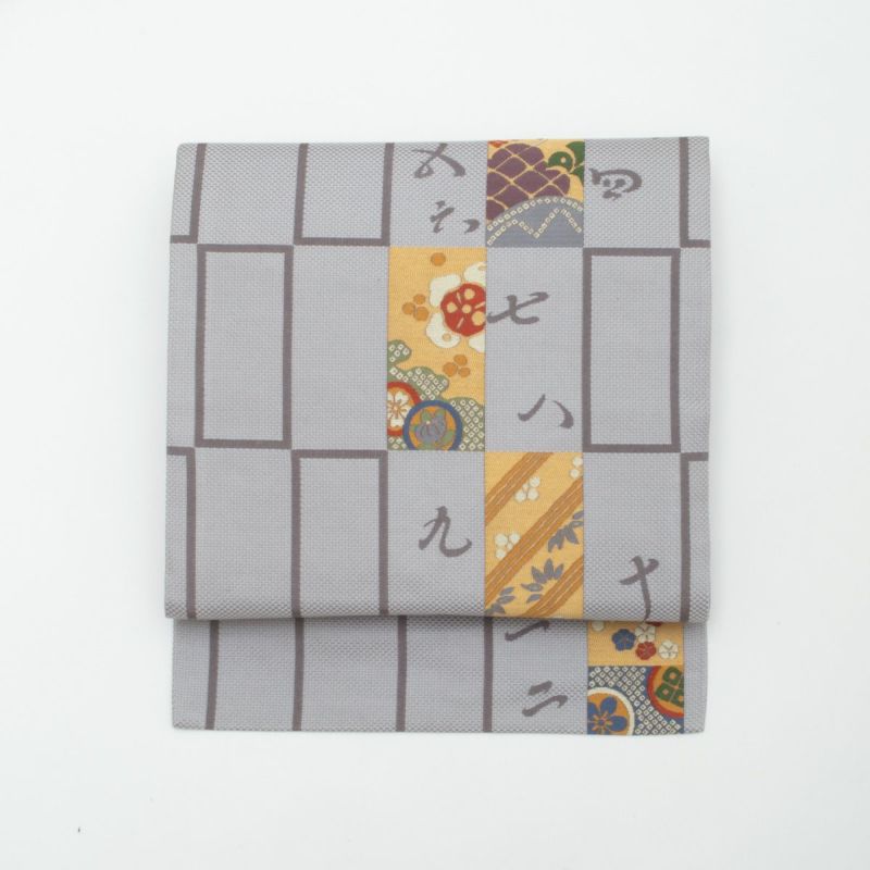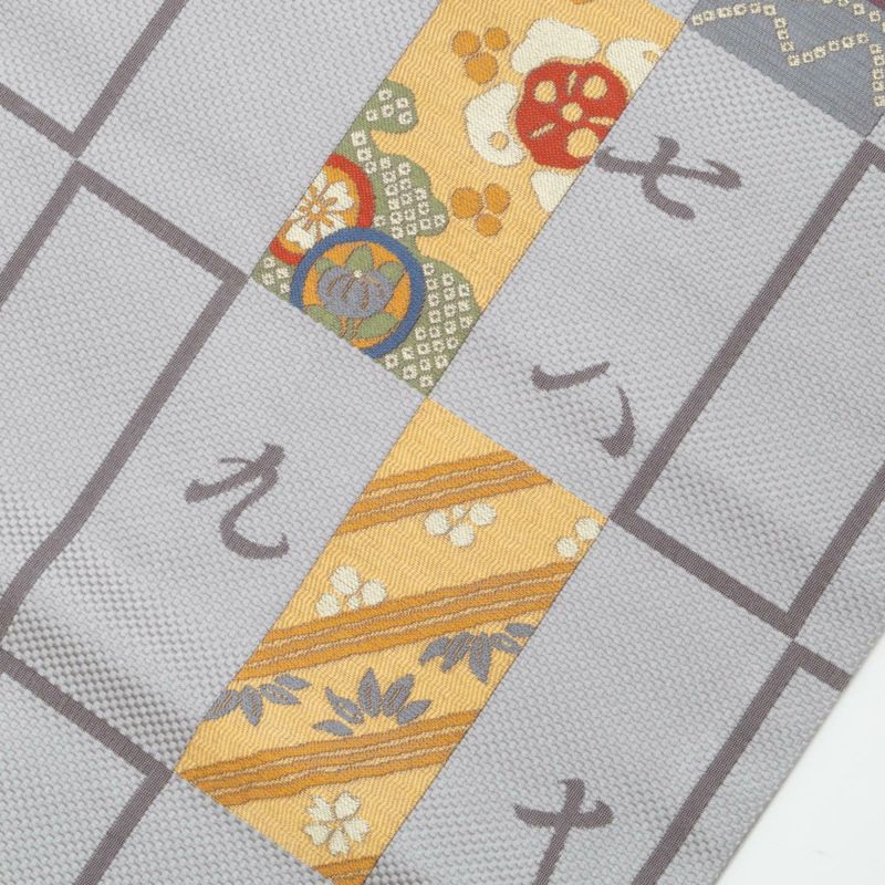 【美品】名古屋帯 一二三柄 疋田 割り付け文 市松取り グレー 正絹 九寸です。