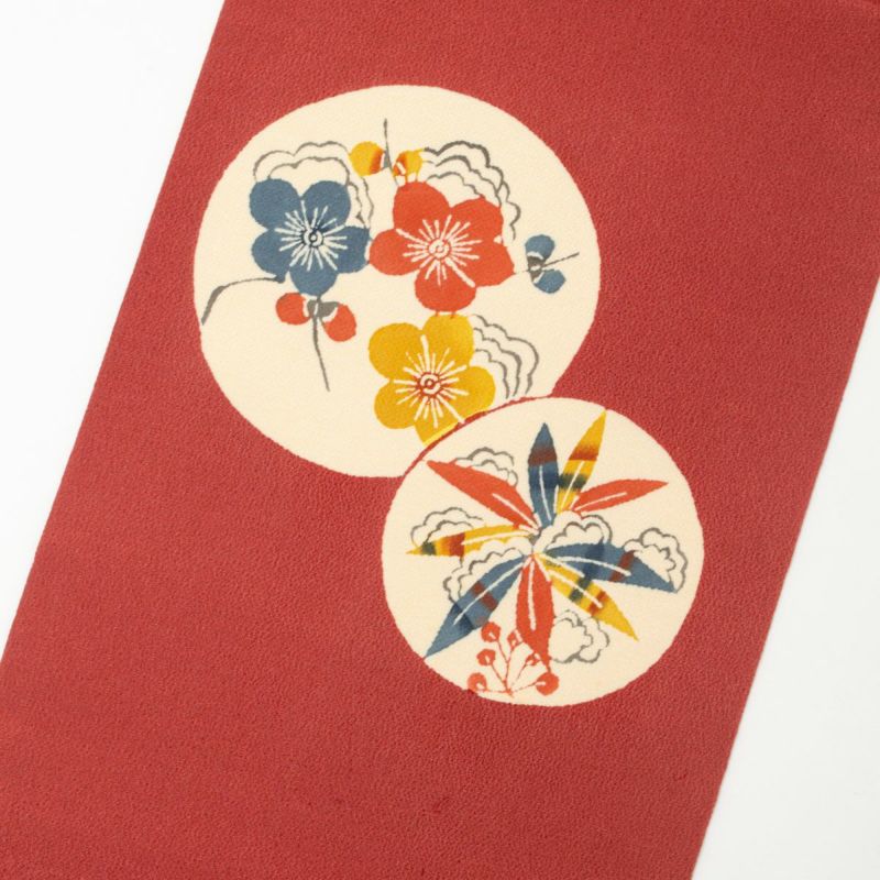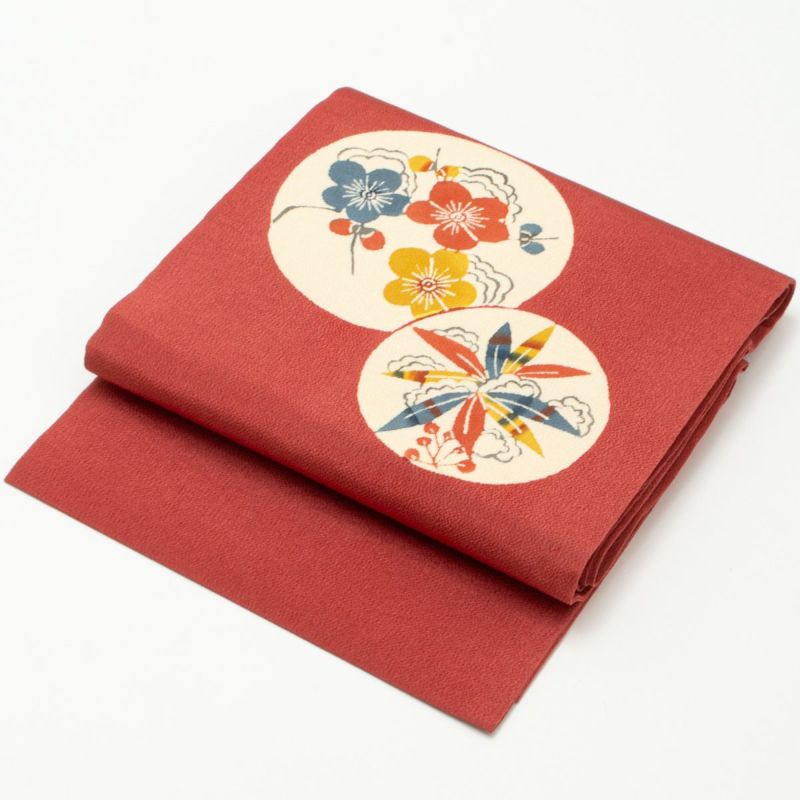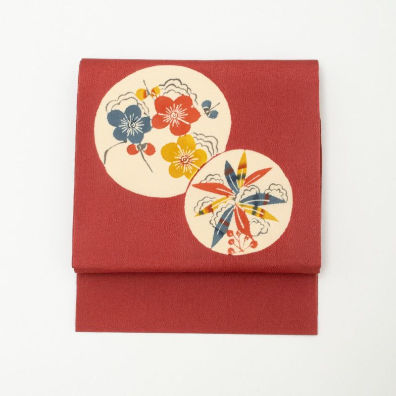 開き名古屋帯 縮緬 型絵染め 丸文 植物紋 臙脂 正絹 九寸です。