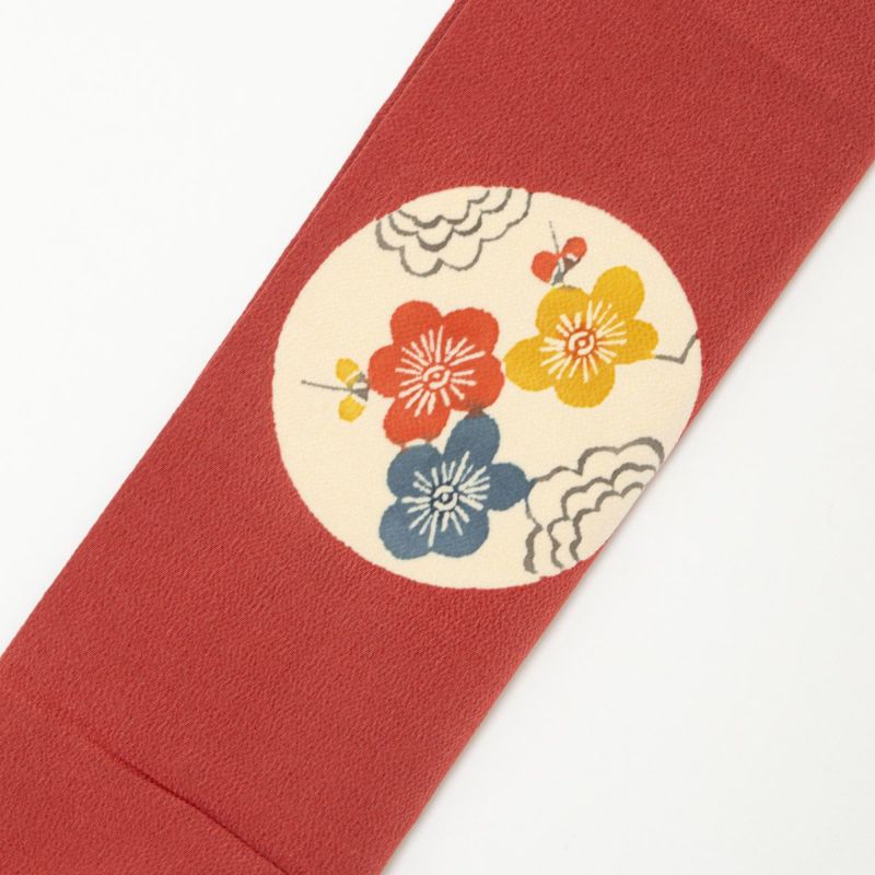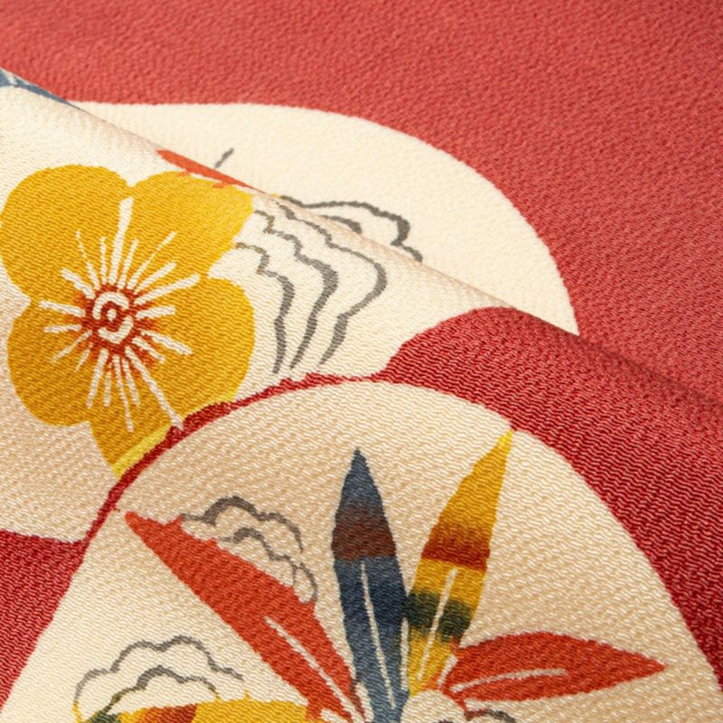 温かみのある臙脂の地色と、控えめな彩色で描かれた文様が調和し、落ち着いた華やかさを演出します。