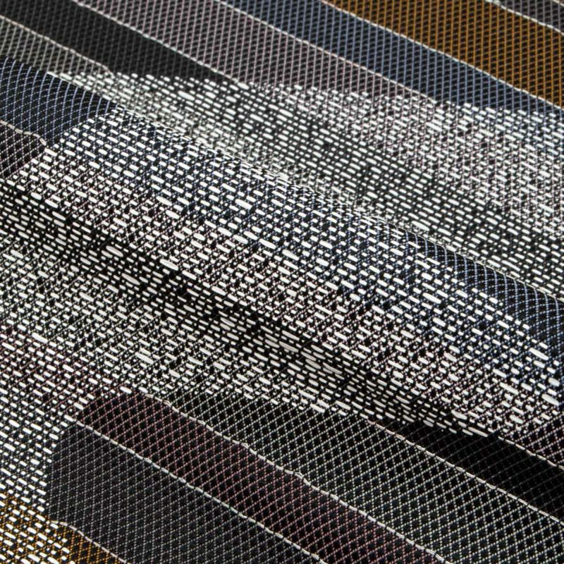 その上に重ねられた銀糸の曲線が、モダンな抽象文様を描き、都会的でスタイリッシュな印象に。角度によってきらめく金銀糸が、コーディネートに品あるアクセントを添えます。