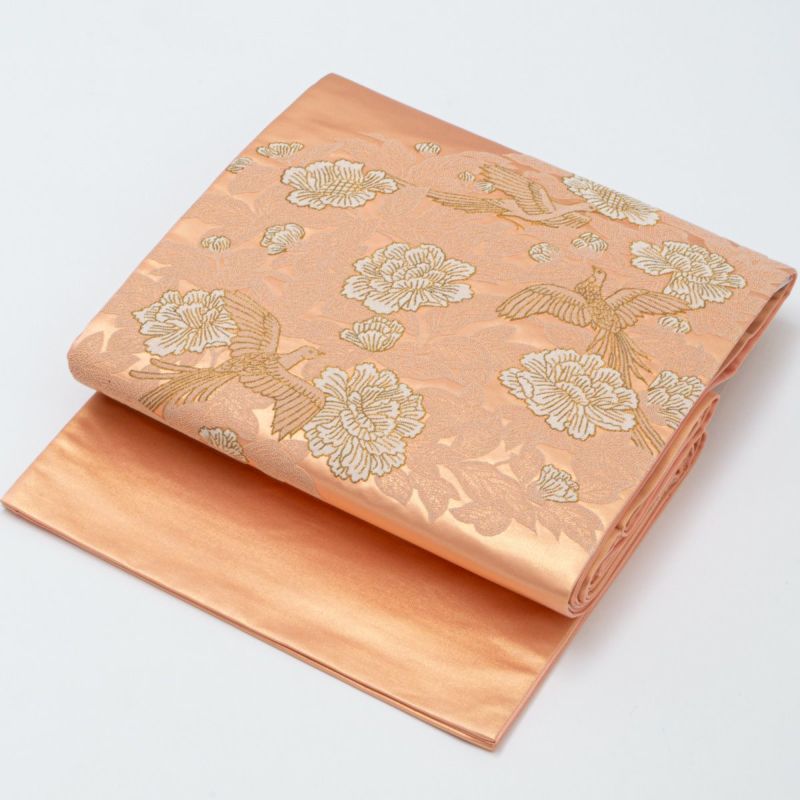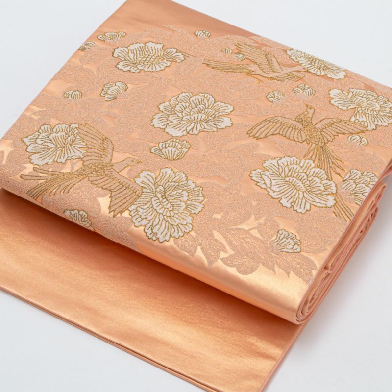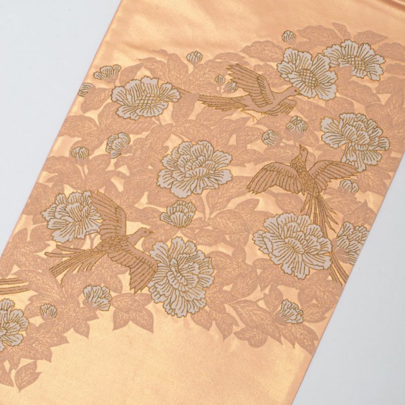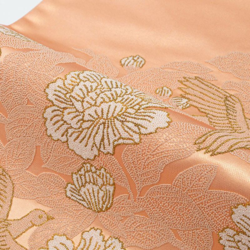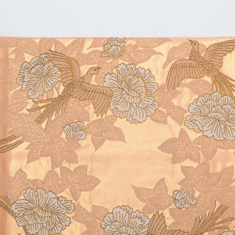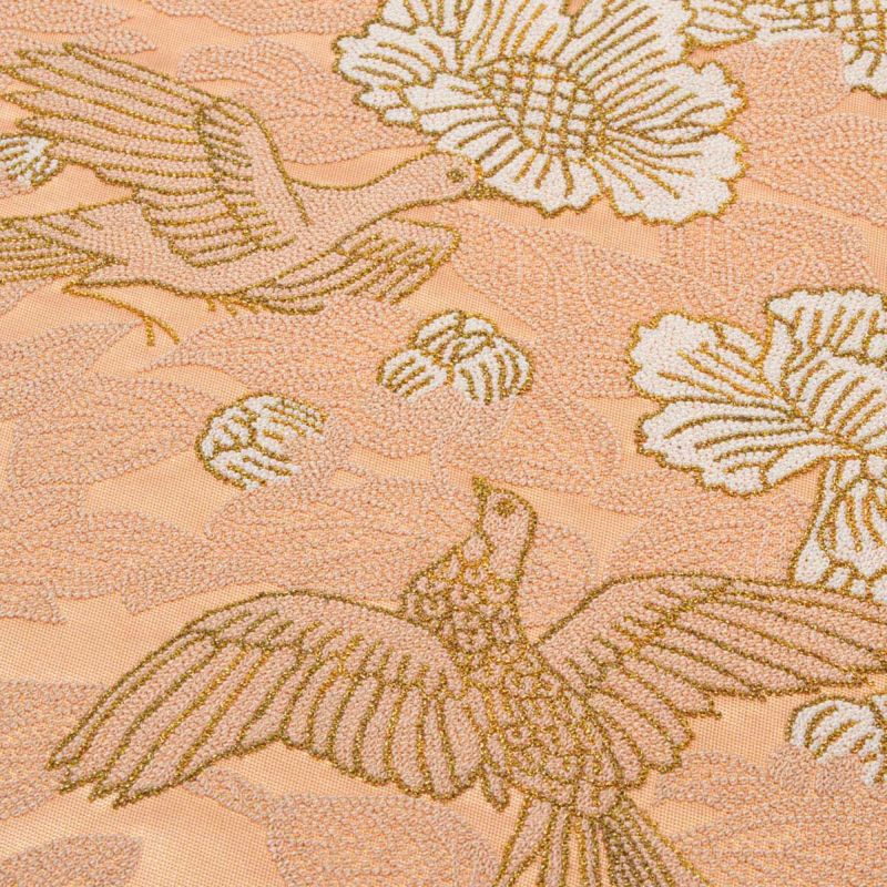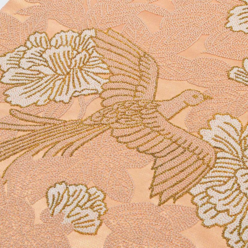 柔らかな光沢を持つ帯地には、瑞鳥が舞い、華やかな牡丹が咲き誇る吉祥の意匠が全面に広がり、優雅で格調高い印象を与えます。