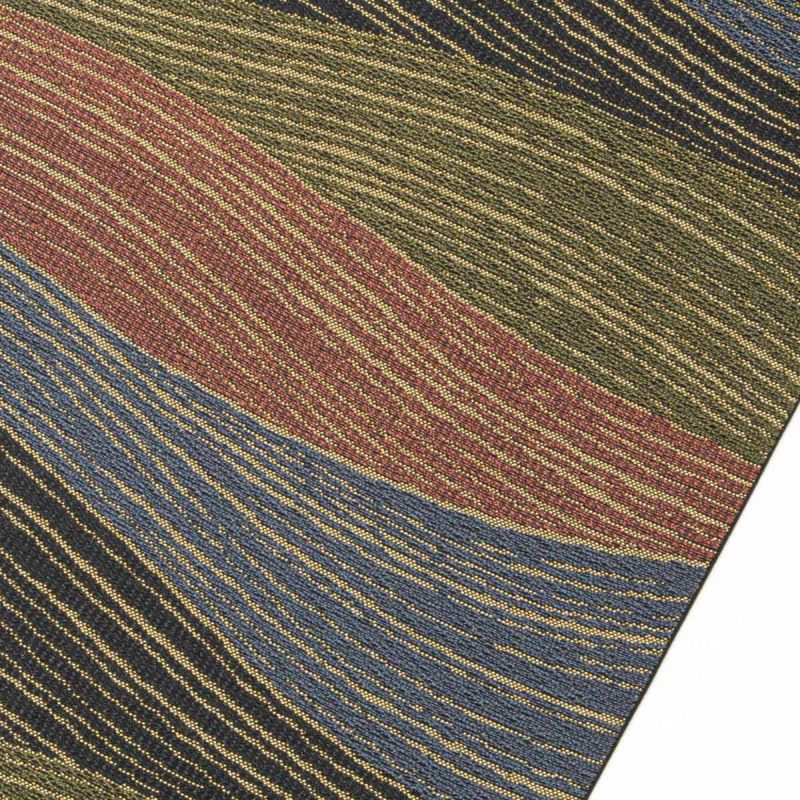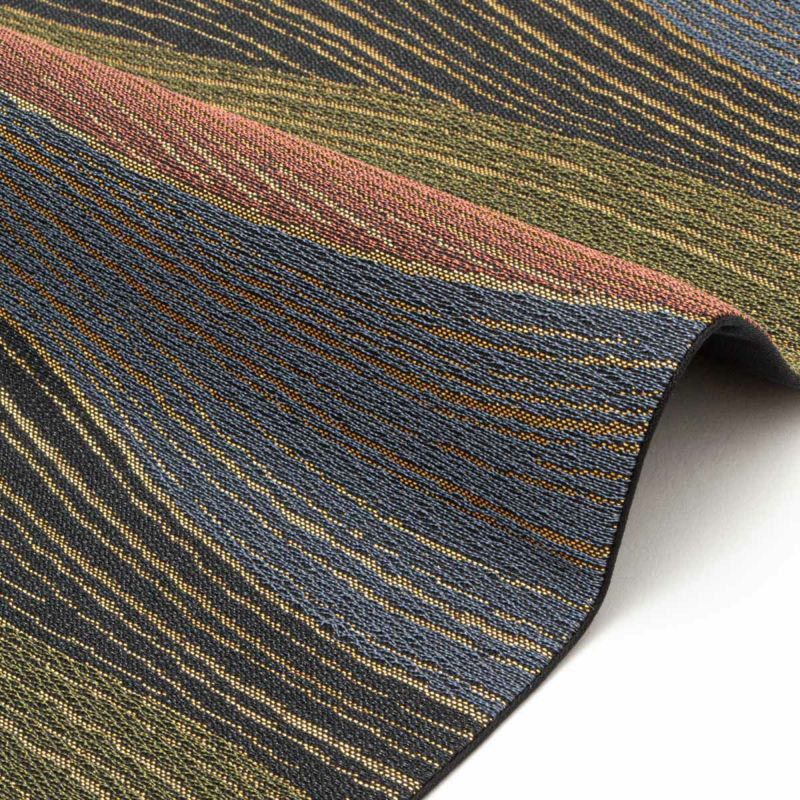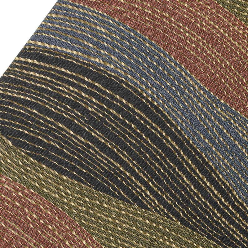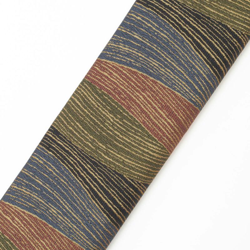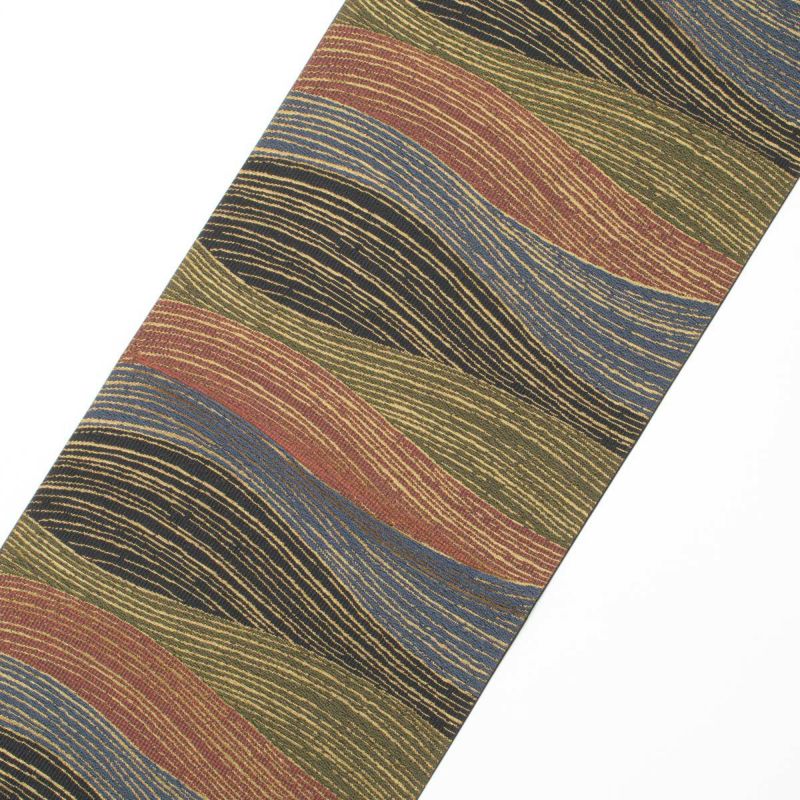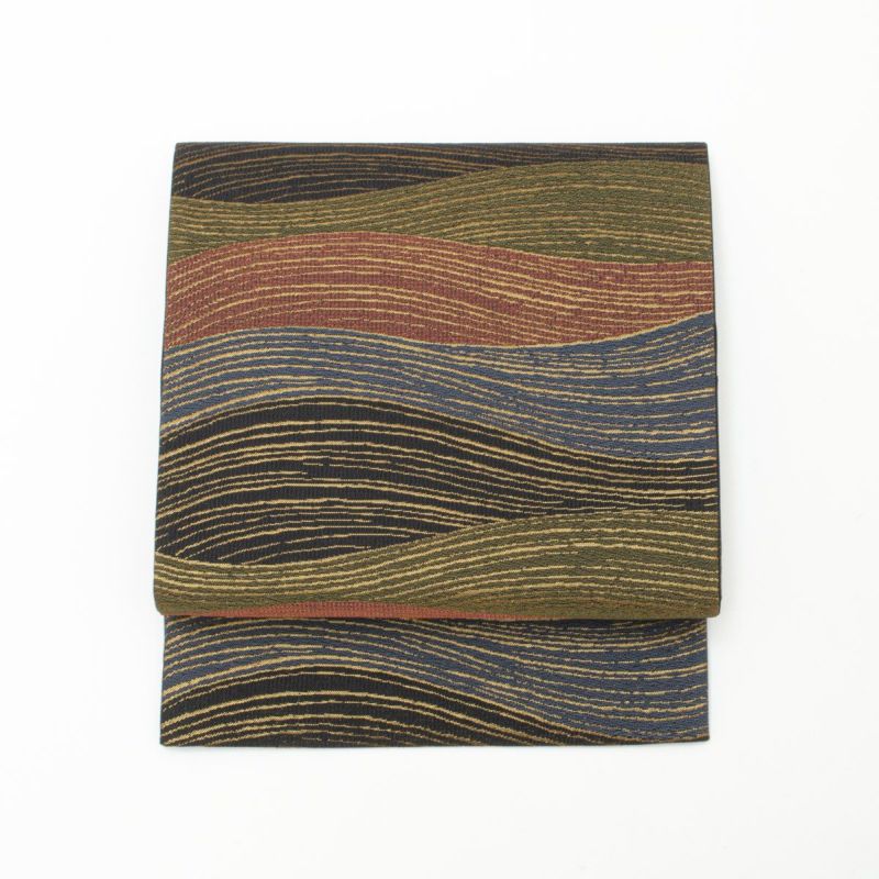 黒を基調に、深い緑、渋い茶、柔らかな青など、落ち着きのある多色の波が織りなされ、そこに金糸が細やかに流れを描くように織り込まれています。