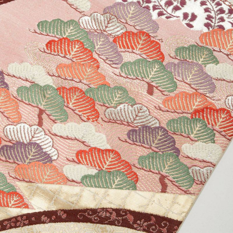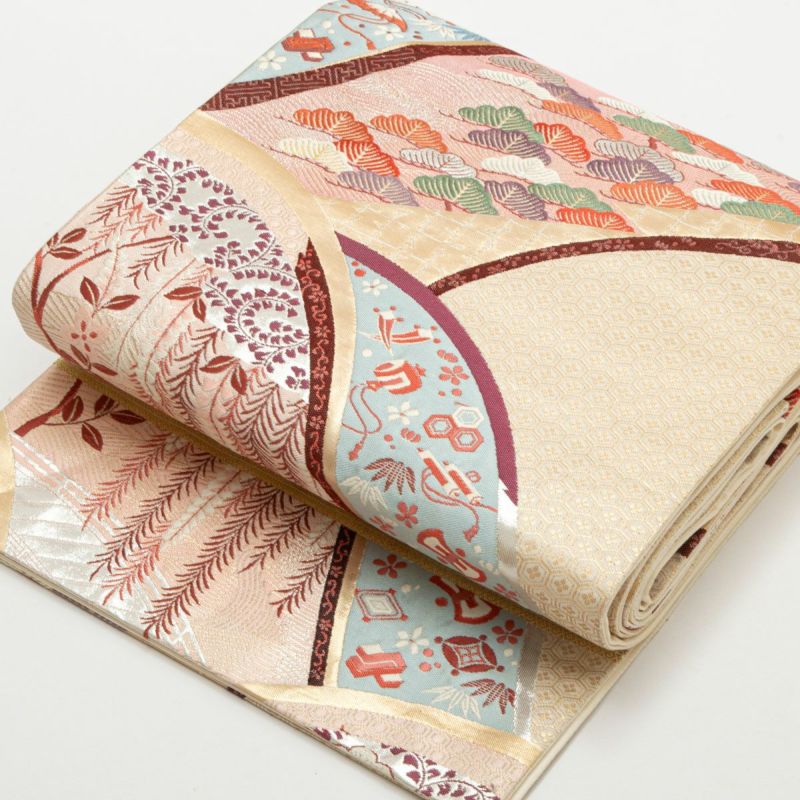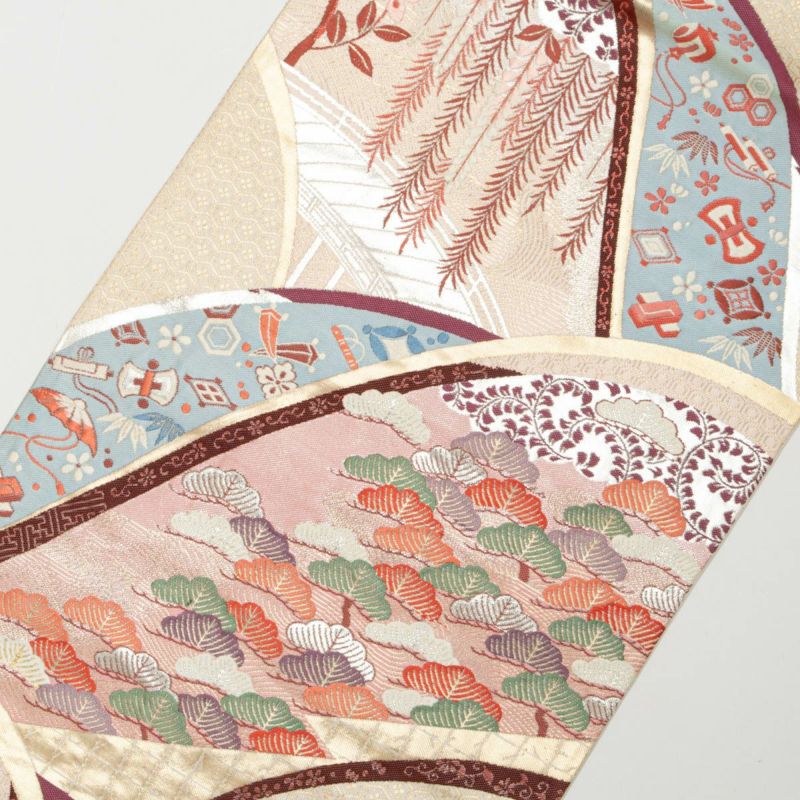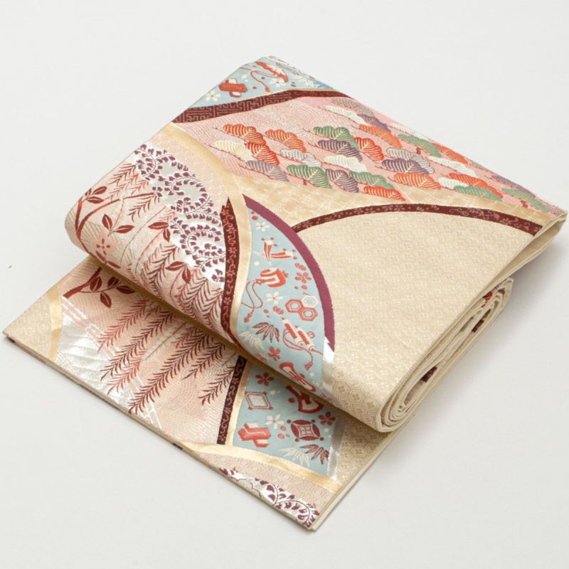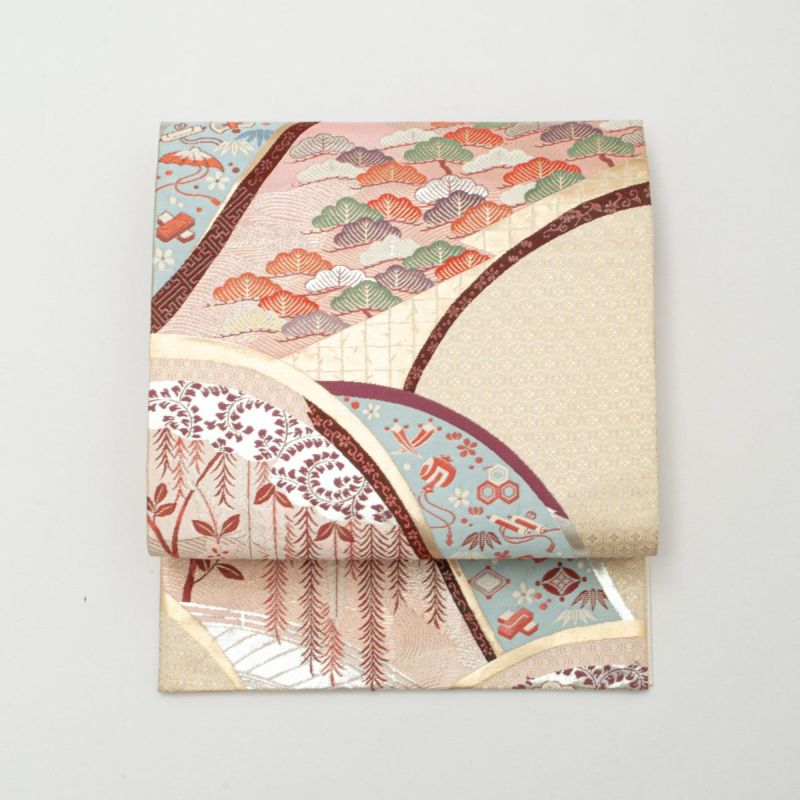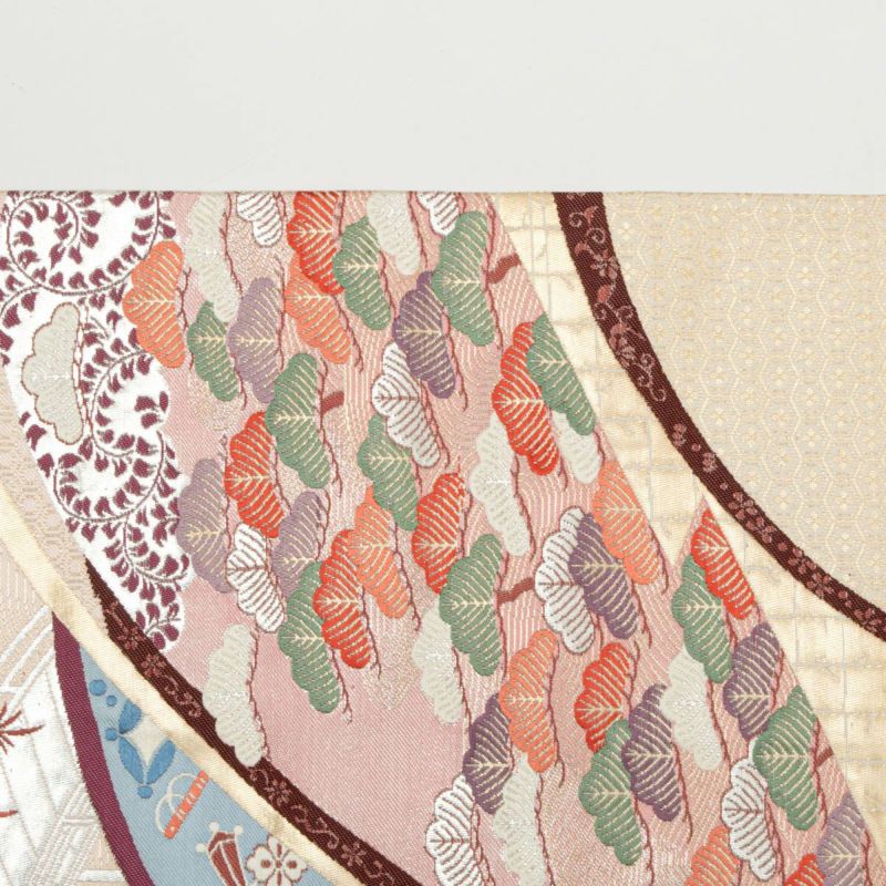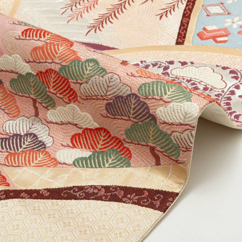 クリーム系の地に、遠山取りの構図で織り出された吉祥文様がふんだんに施され、目にも鮮やかな意匠に仕上がっています。