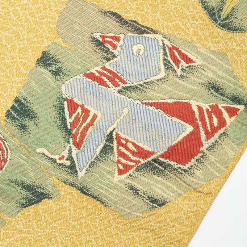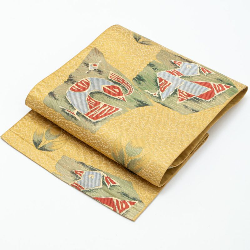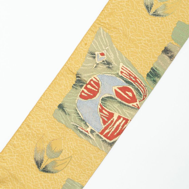 幾何学的にデフォルメされた瑞鳥と、葉を象った植物文が散りばめられた名古屋帯です。