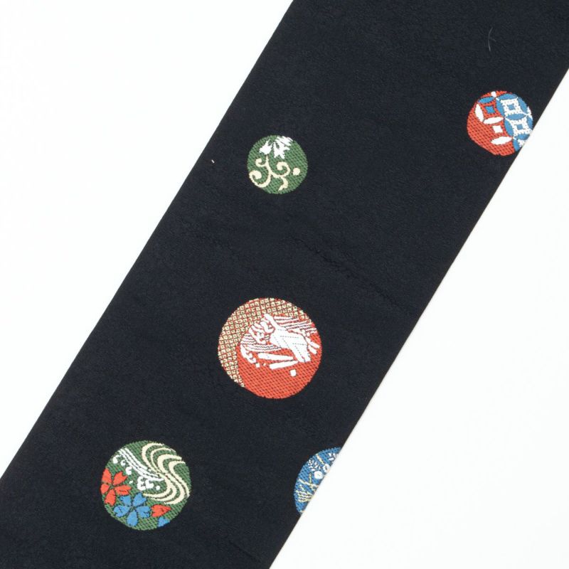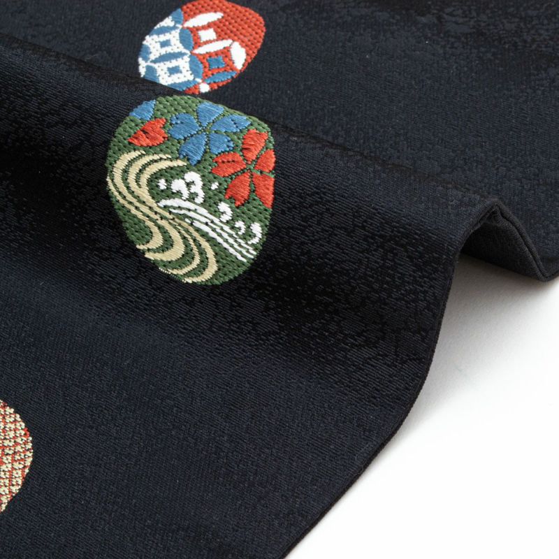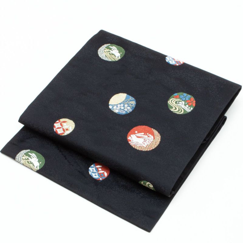 落ち着いた黒を基調としつつ、柄の部分には淡い多色が用いられており、合わせる着物によって印象が変わるのも魅力の一つ。紬や小紋、無地感のある着物などと相性よく、帯まわりを楽しく演出してくれます。