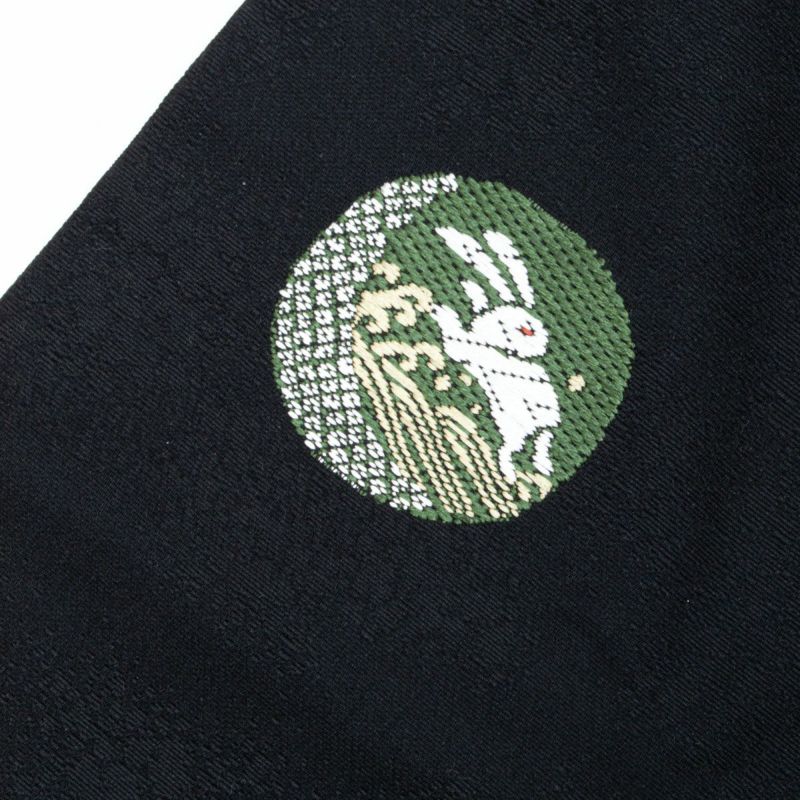 丸文の中に七宝文様や秋草が配され、格調と遊び心が絶妙に調和したデザイン。白兎の可愛らしさと、七宝や草花の優美さが相まって、シックながらも柔らかな華やぎを感じさせます。