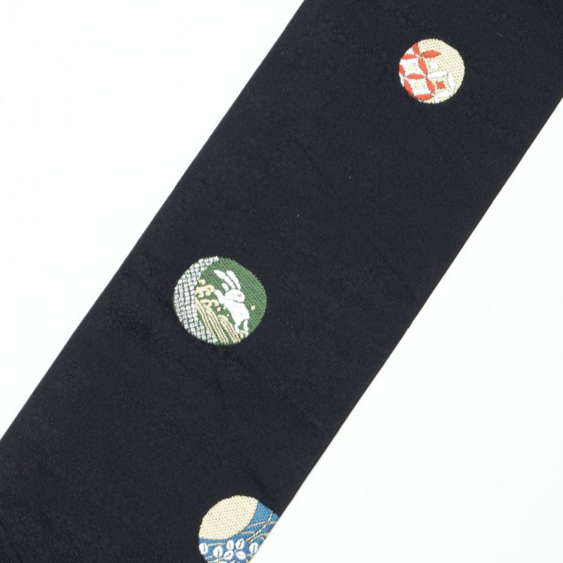 黒地に浮かび上がる白兎が印象的な、モダンな名古屋帯です。