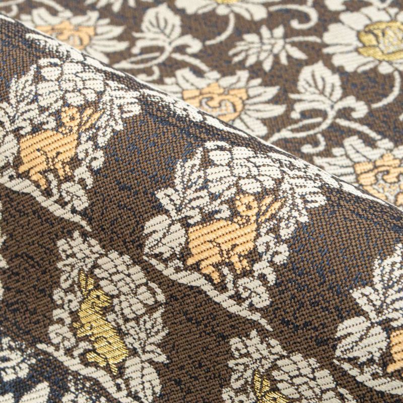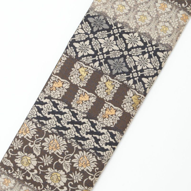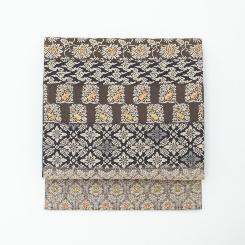 【美品】京袋帯 名物裂 花兎 花唐草 横段取り ブラウン 黒 金糸 西陣織 正絹です。