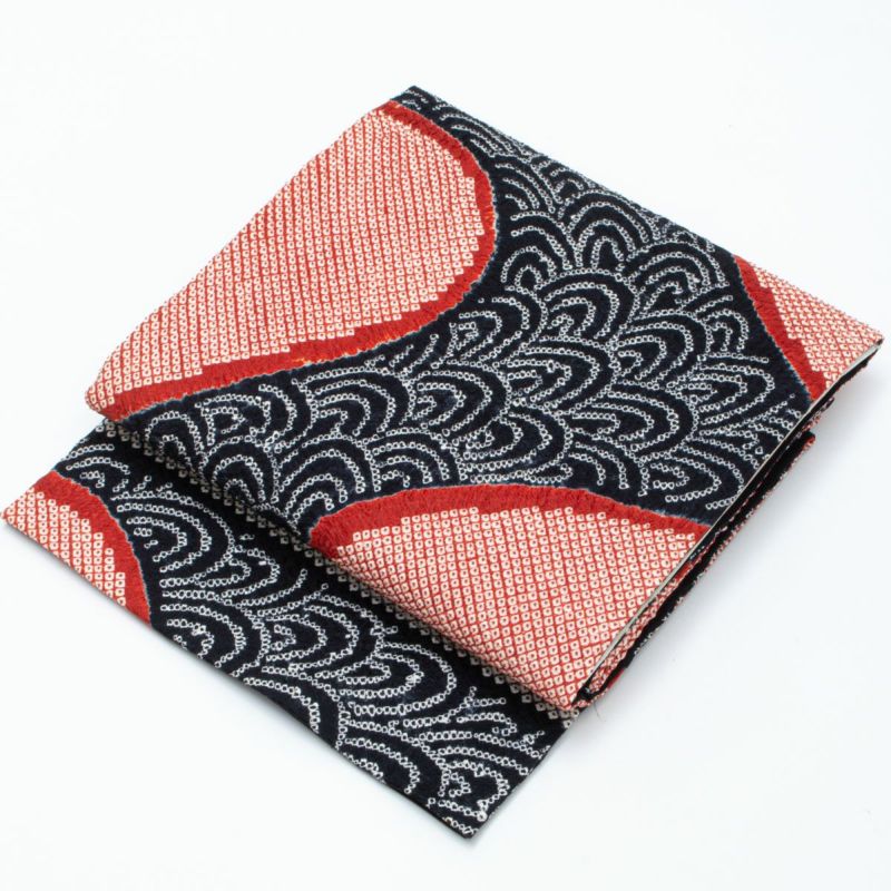 開き名古屋帯 総絞り 鹿の子 青海波 黒 疋田丸文 赤錆色 正絹 九寸です。