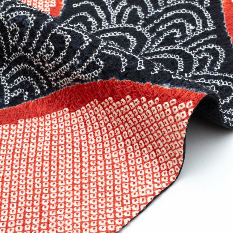 文様は鹿の子絞りを用いた青海波を基調に、赤錆色の疋田丸文が大胆に配されています。