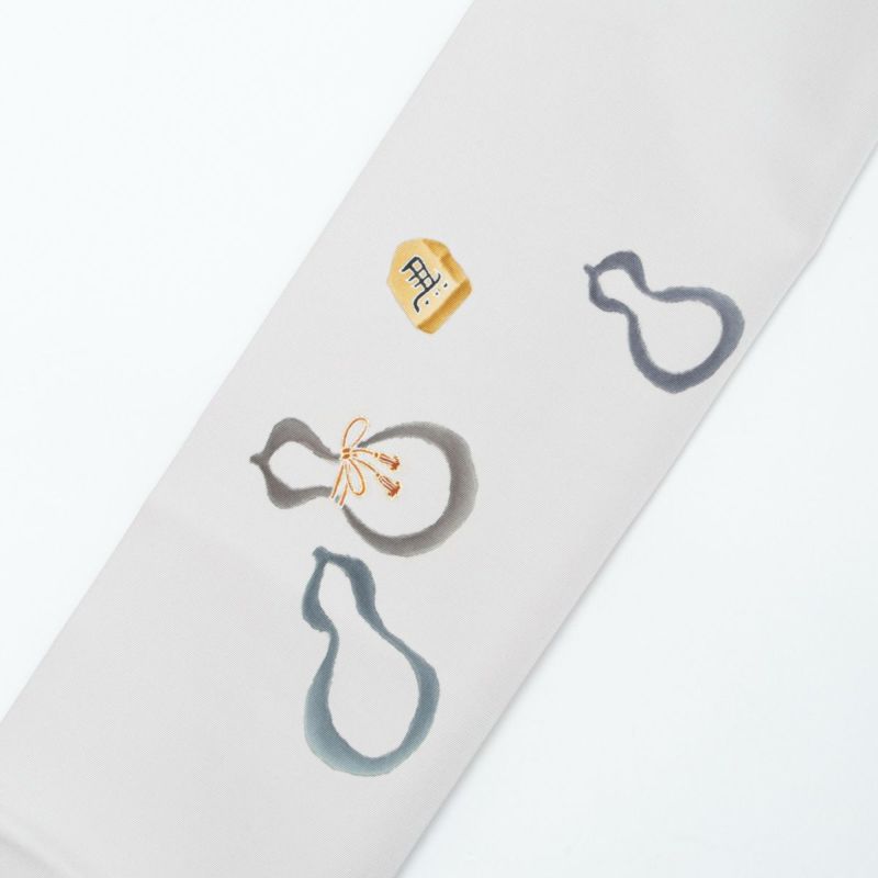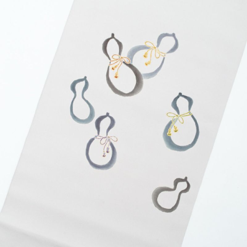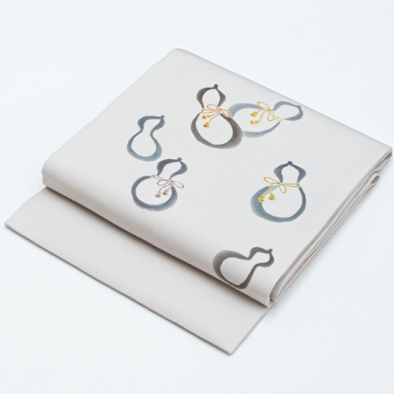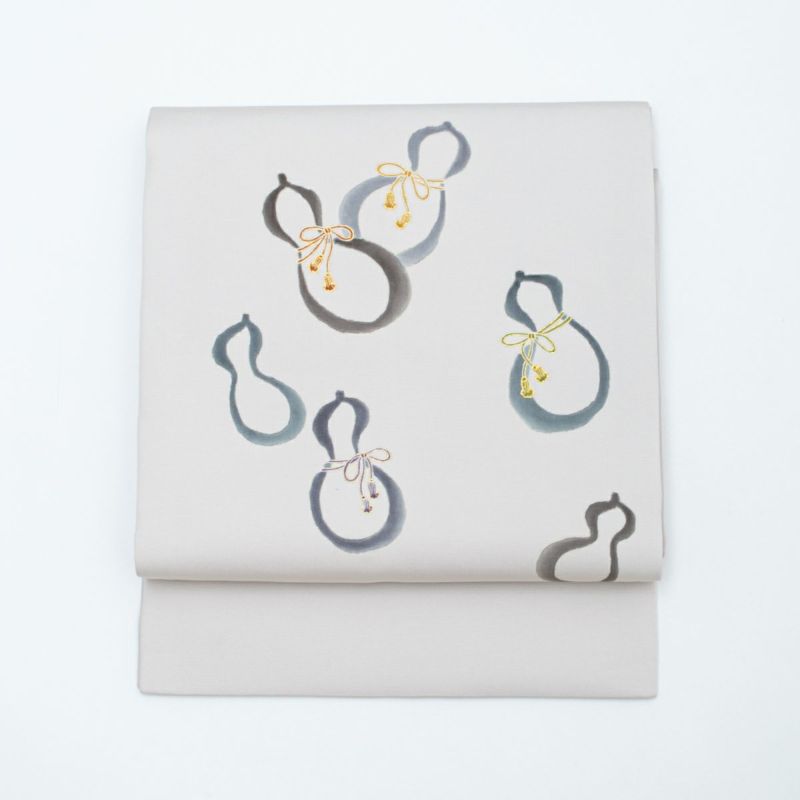 絹鼠色の塩瀬地に、手描き友禅で描かれた瓢箪(ひょうたん)の図が可憐に並ぶ開き名古屋帯です。