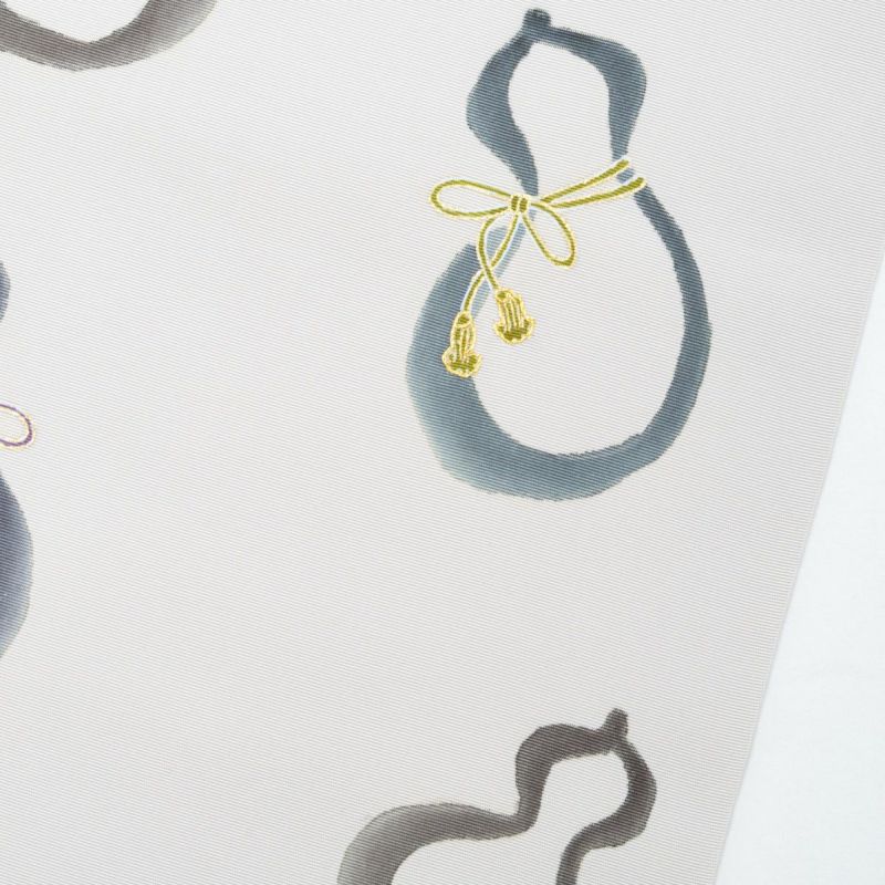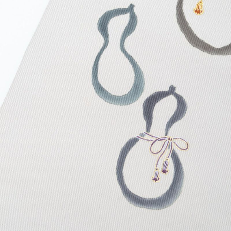 墨絵調の柔らかなタッチで輪郭を描いた瓢の意匠には、それぞれ金彩や多彩な組紐が結ばれ、控えめながらも上品な華やかさを添えています。