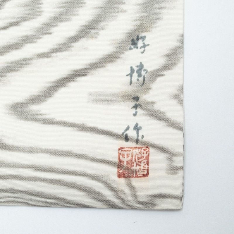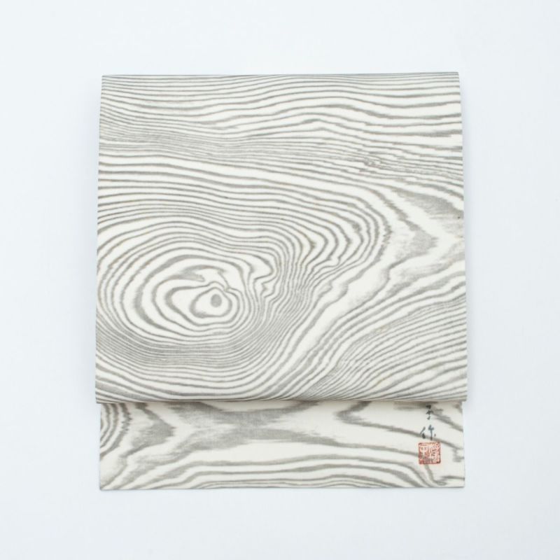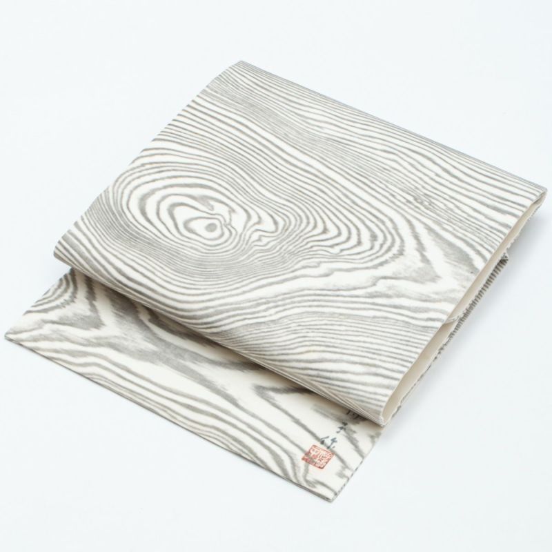 【熊谷好博子】名古屋帯 天然自然の造形 塩瀬 白 グレー 未使用品 正絹 九寸 です。