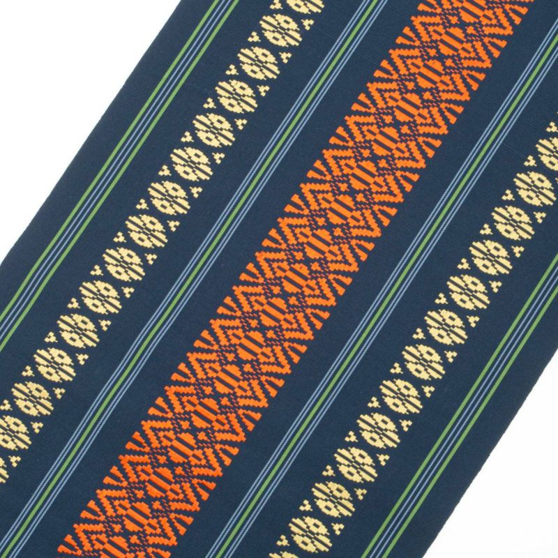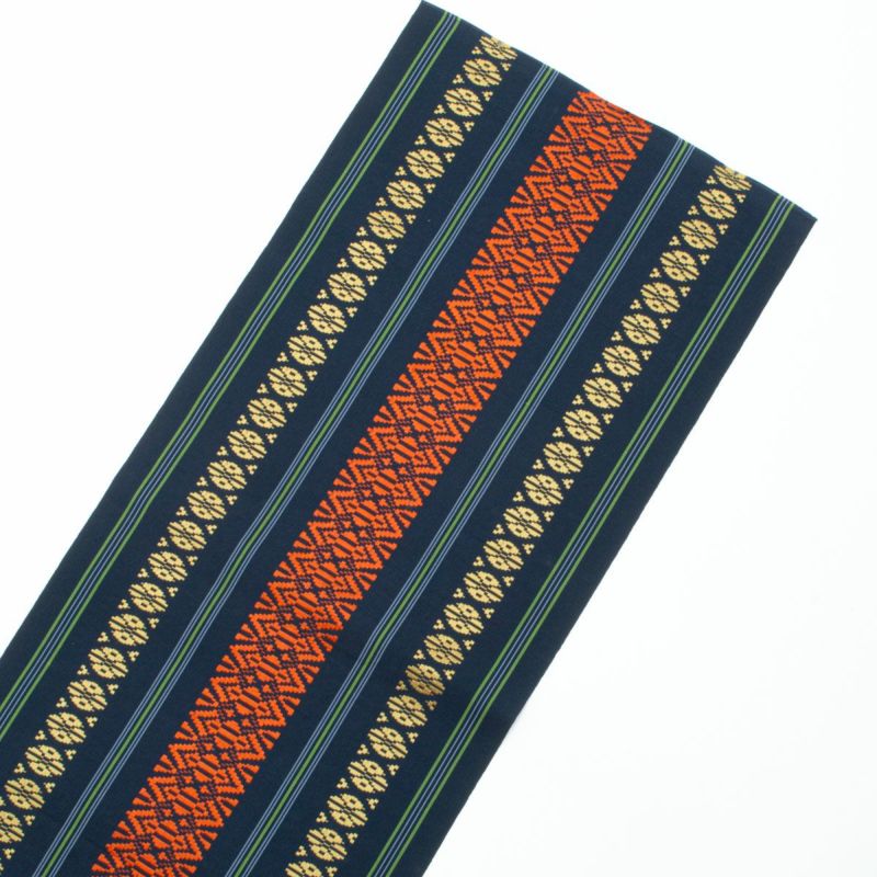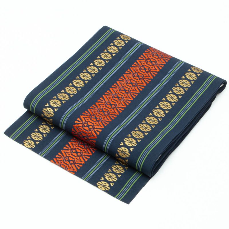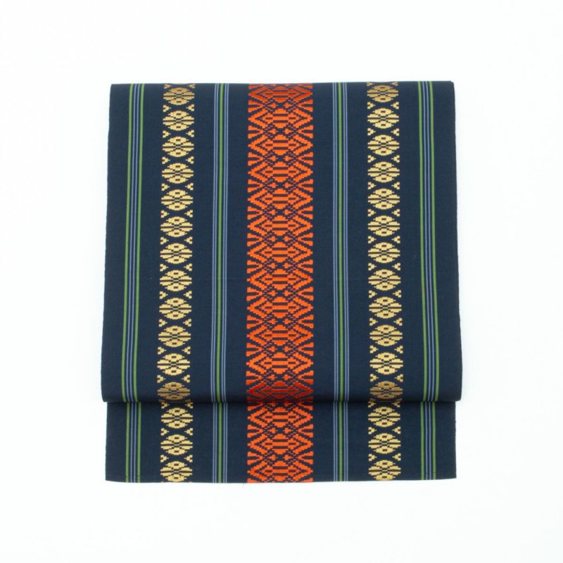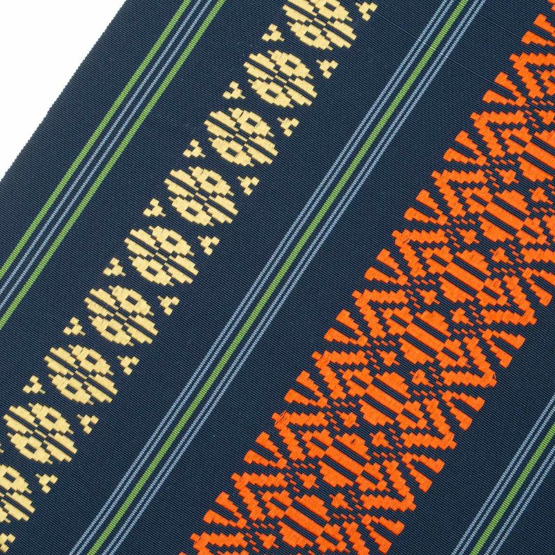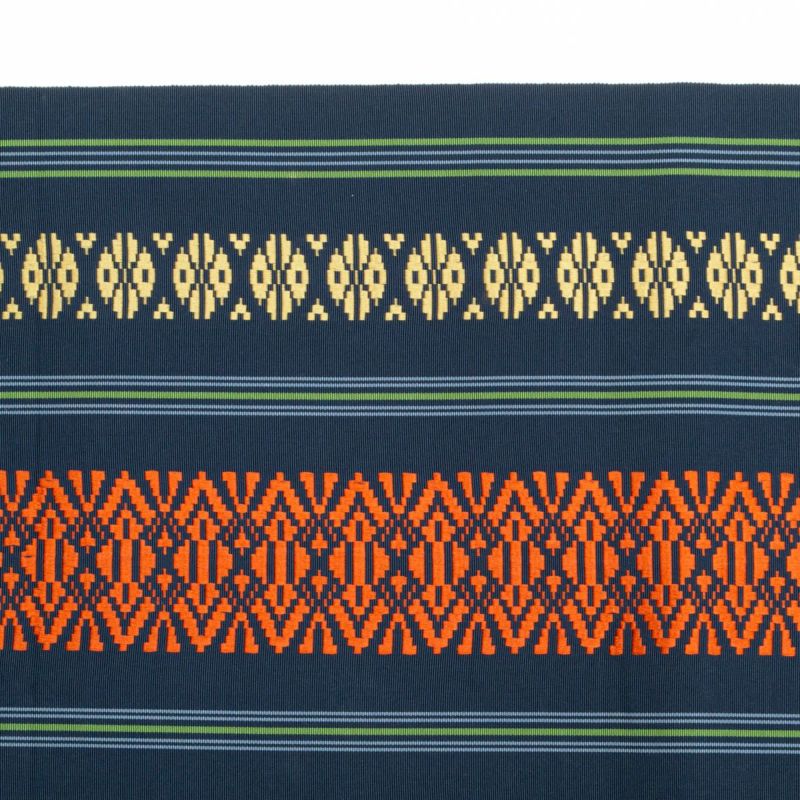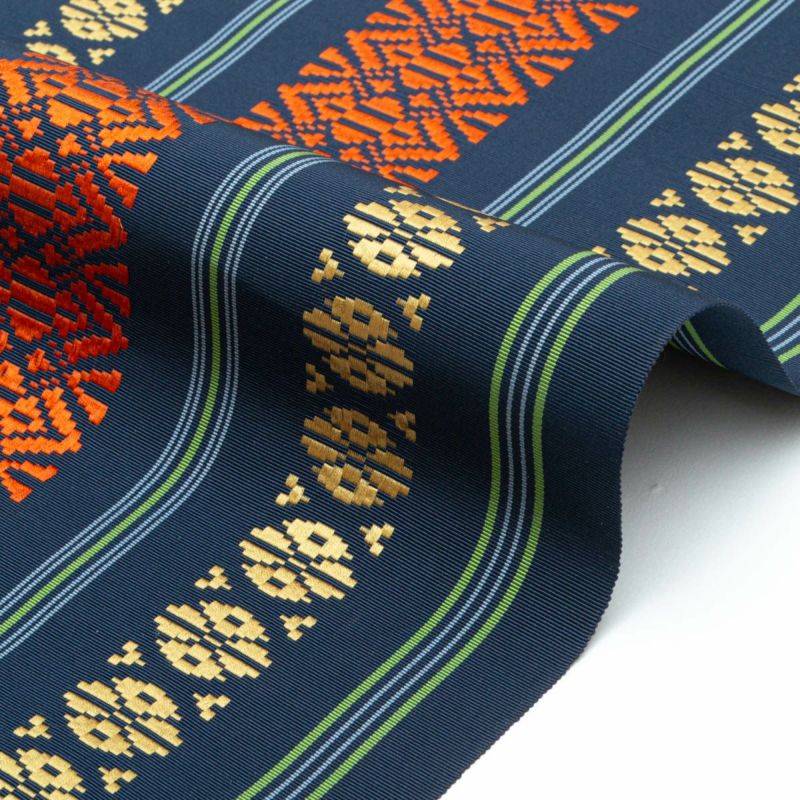 深みのある紺地に、赤や黄色、緑、青などの彩り豊かな糸を用いた繊細な織柄が印象的で、着姿を引き締めつつも華やかに彩ります。