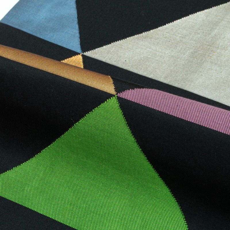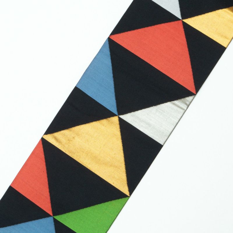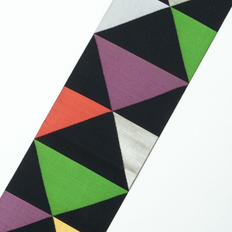 黒地を基調に、色とりどりの鱗文(うろこもん)が規則的に配された艷やかな名古屋帯です。