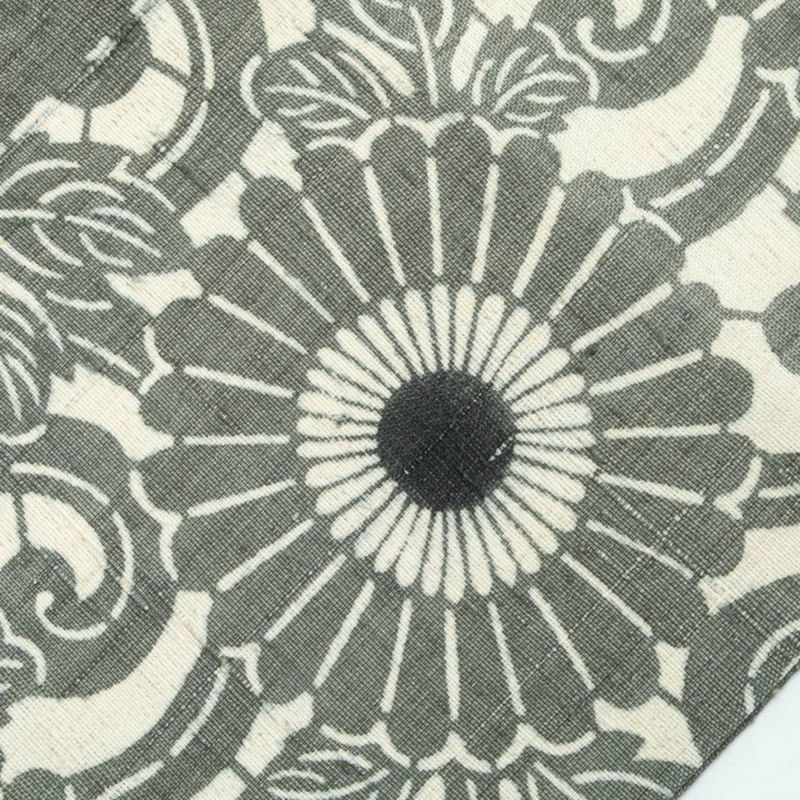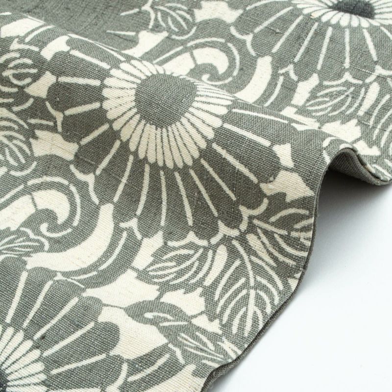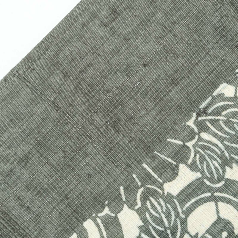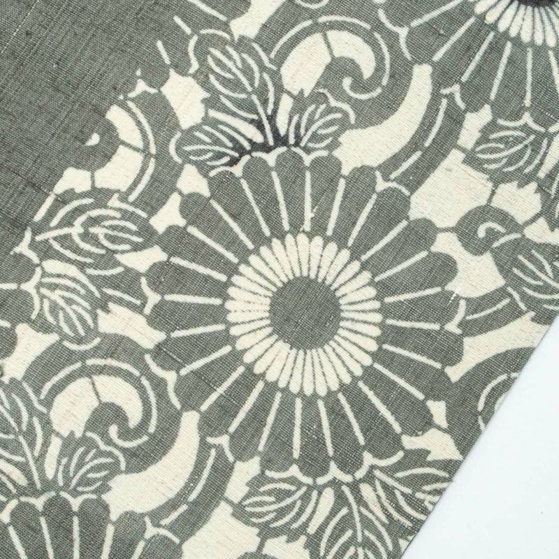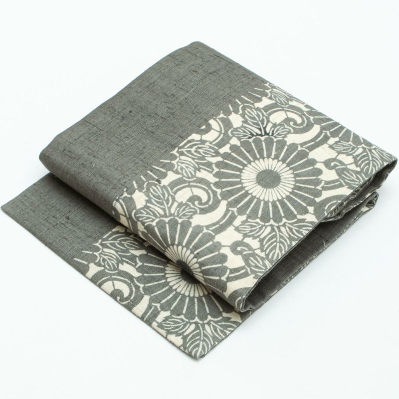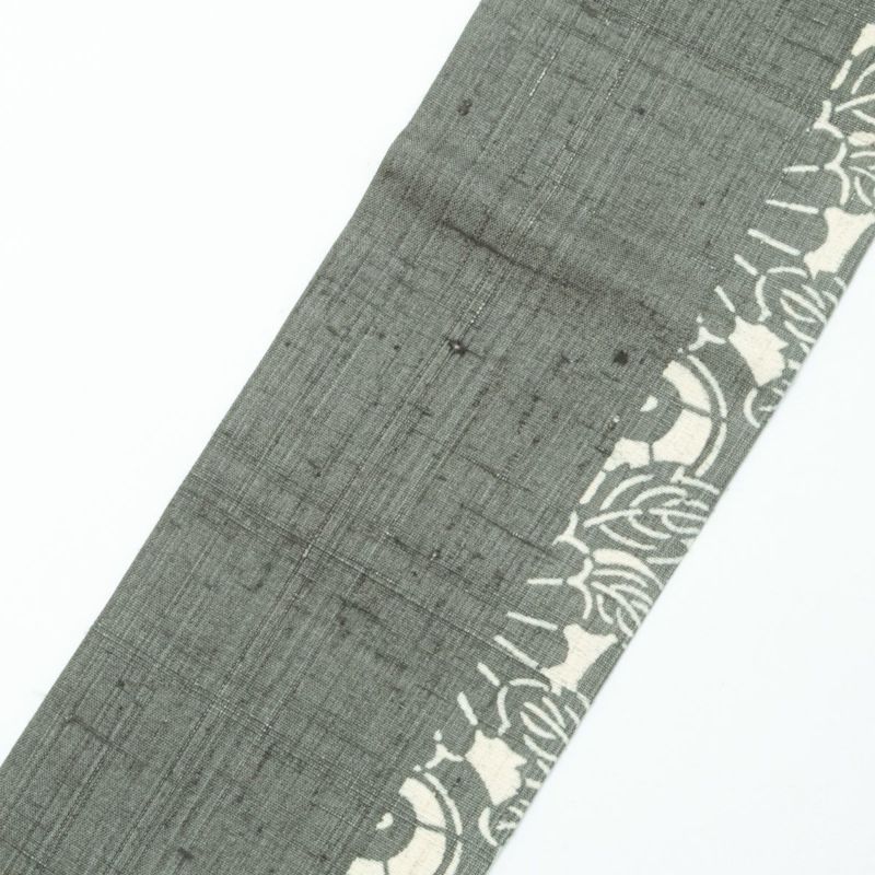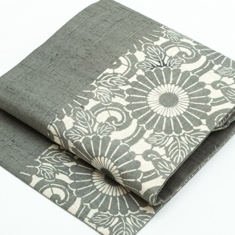 落ち着いたグレーの真綿紬地に、型絵染めによる菊唐草文があしらわれた、上質な名古屋帯です。
