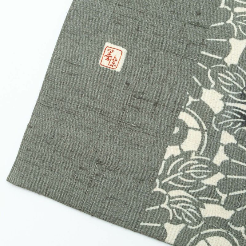 【未使用品】名古屋帯 真綿紬 型絵染め 菊唐草 暈し グレー 白 正絹 九寸 です。