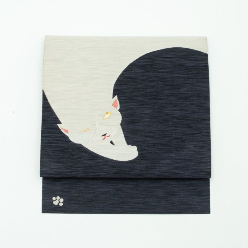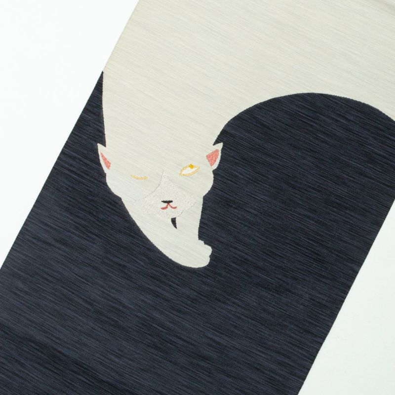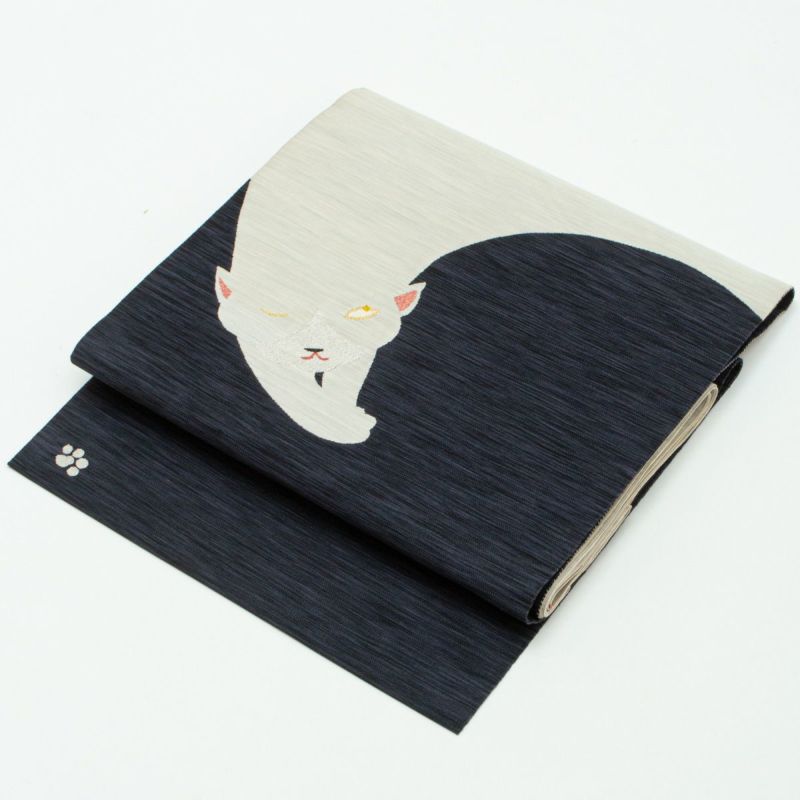 しなやかな曲線で表された猫が大胆に配されたお太鼓柄が印象的で、シンプルながらも目を惹くモダンなデザイン。