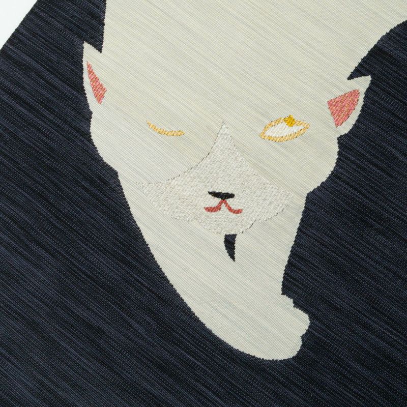 つづれ織りの上質な織で、ウィンクをする猫が描かれた、遊び心あふれる名古屋帯です。