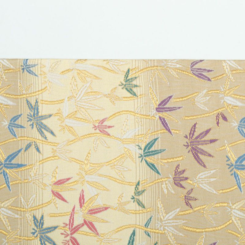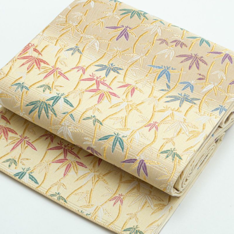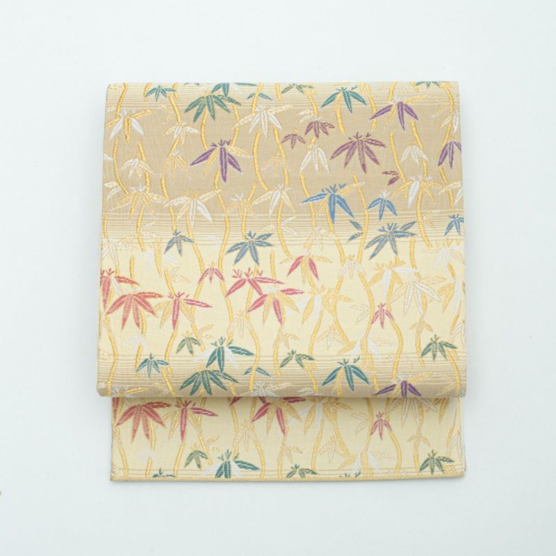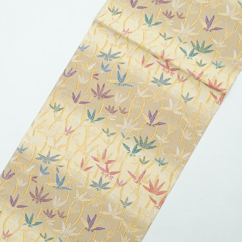 やわらかな ベージュ〜ライトイエローの横段暈し を地に、立涌文と笹の葉があしらわれた袋帯です。