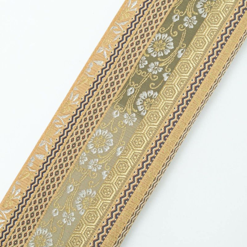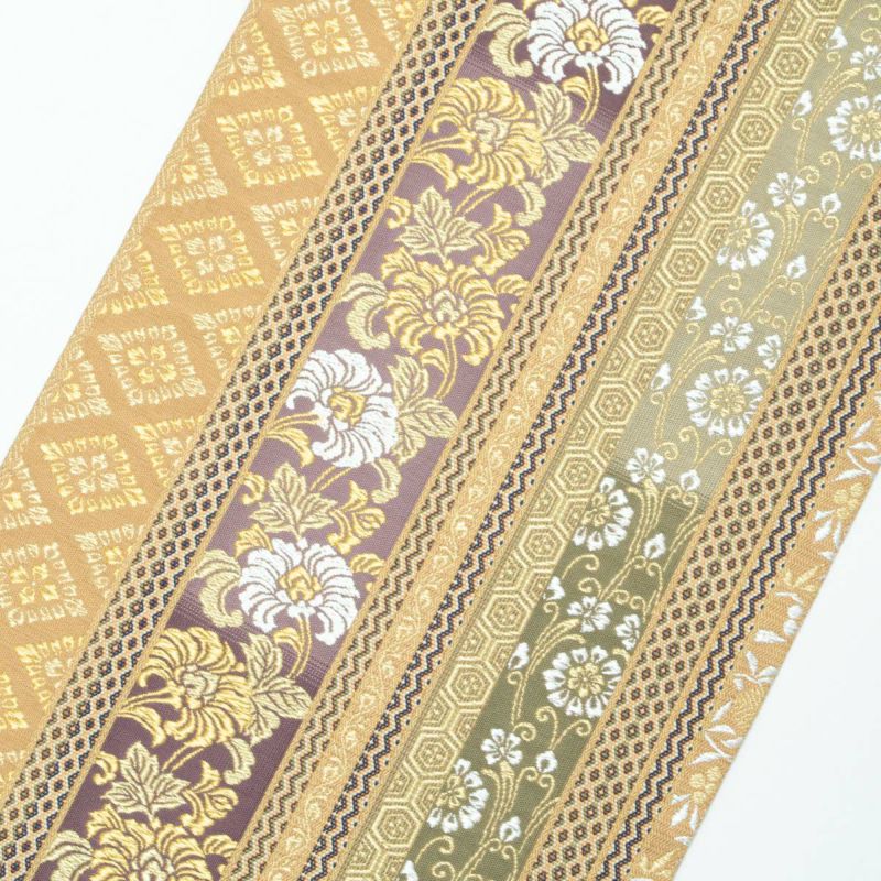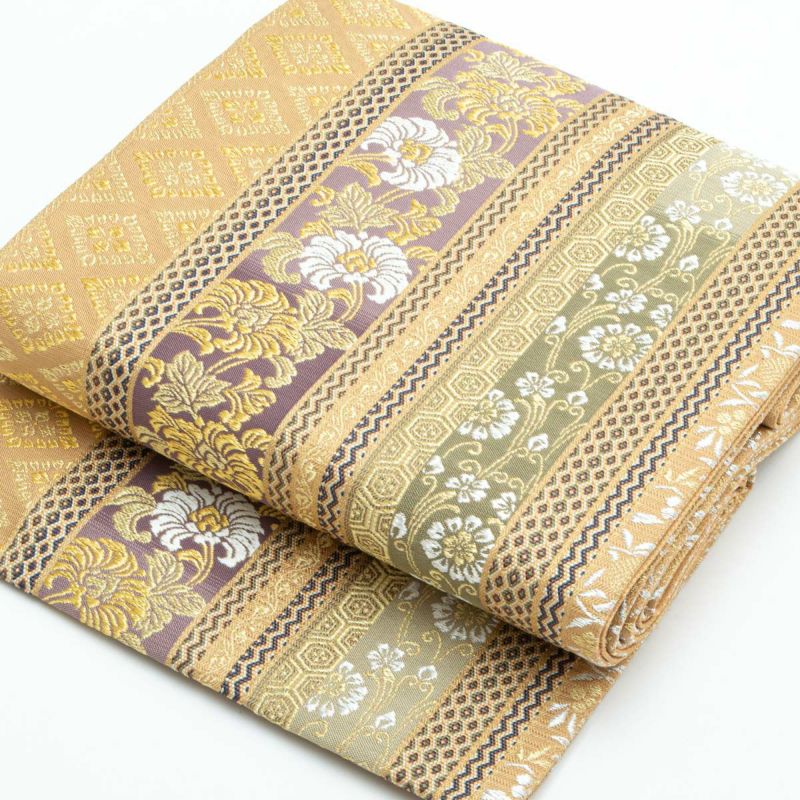 やわらかな金糸が華やかさを演出しつつ、橙や白の色調がほどよい落ち着きをもたらし、幅広い着物に合わせやすい一本です。