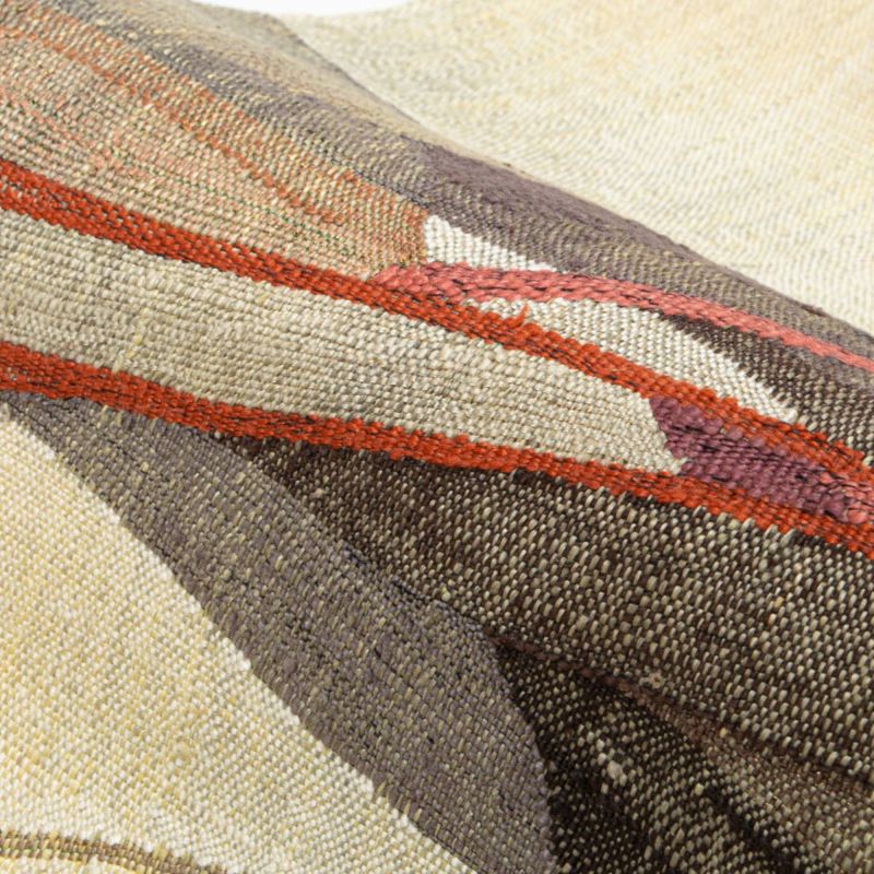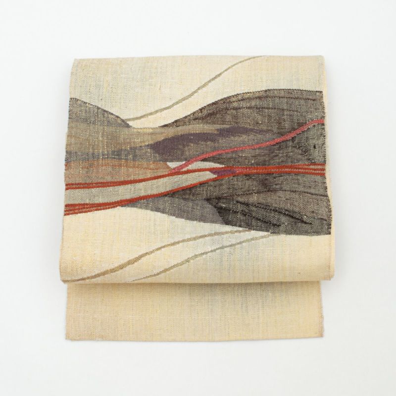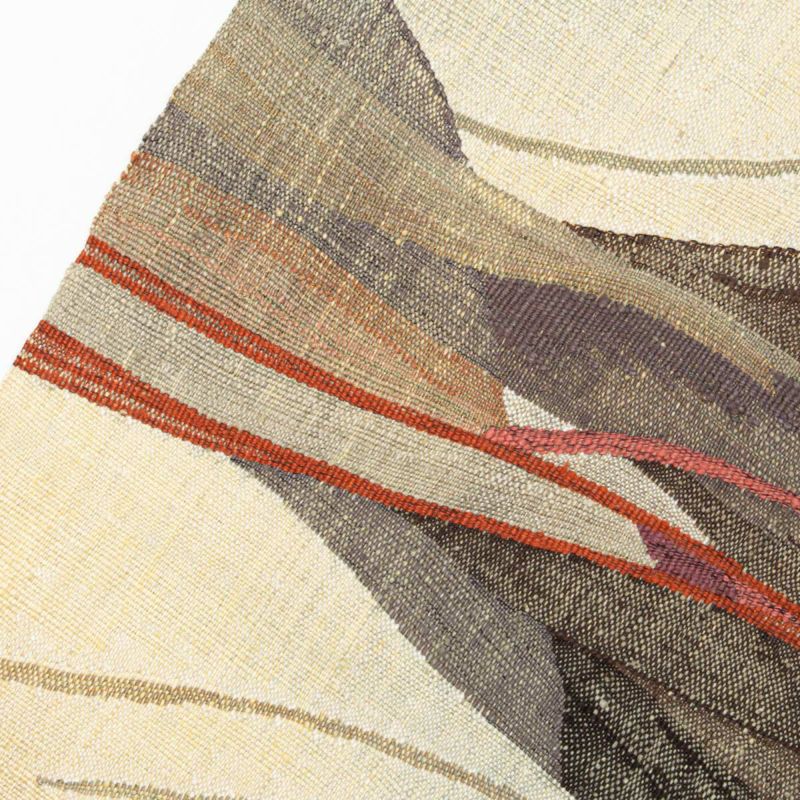 柔らかな生成りを基調に、ブラウン・グレー・赤を差し込んだ抽象的なラインが流れ、モダンで奥行きのある表情を生み出しています。