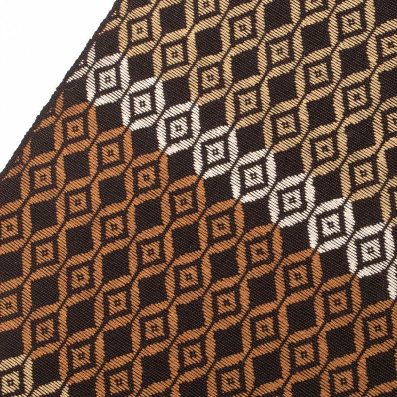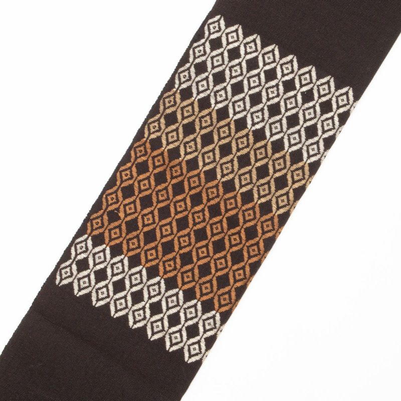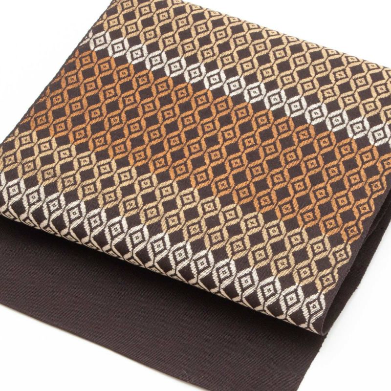 【美品】名古屋帯 モダン 幾何学柄 鉄黒 ブラウン ベージュ 白 正絹 八寸 です。