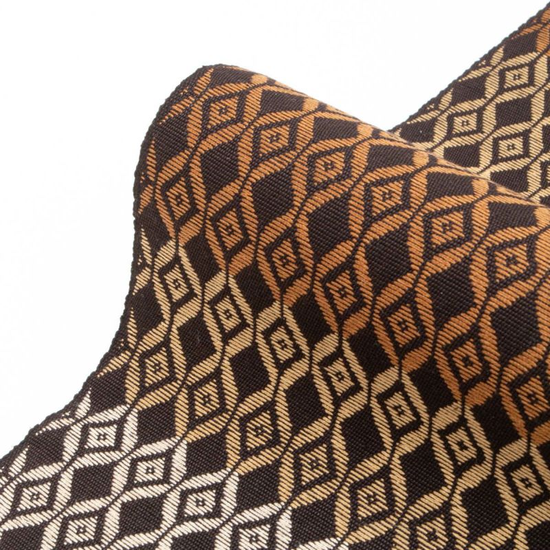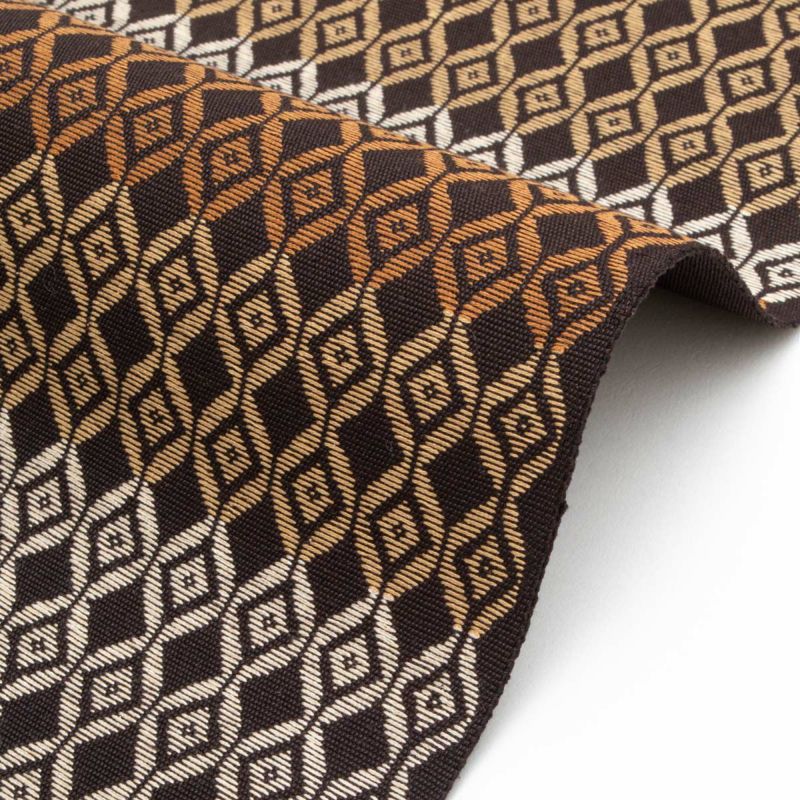 鉄黒地にブラウン〜ベージュ、白を配したモダンな幾何学柄が映える名古屋帯です。