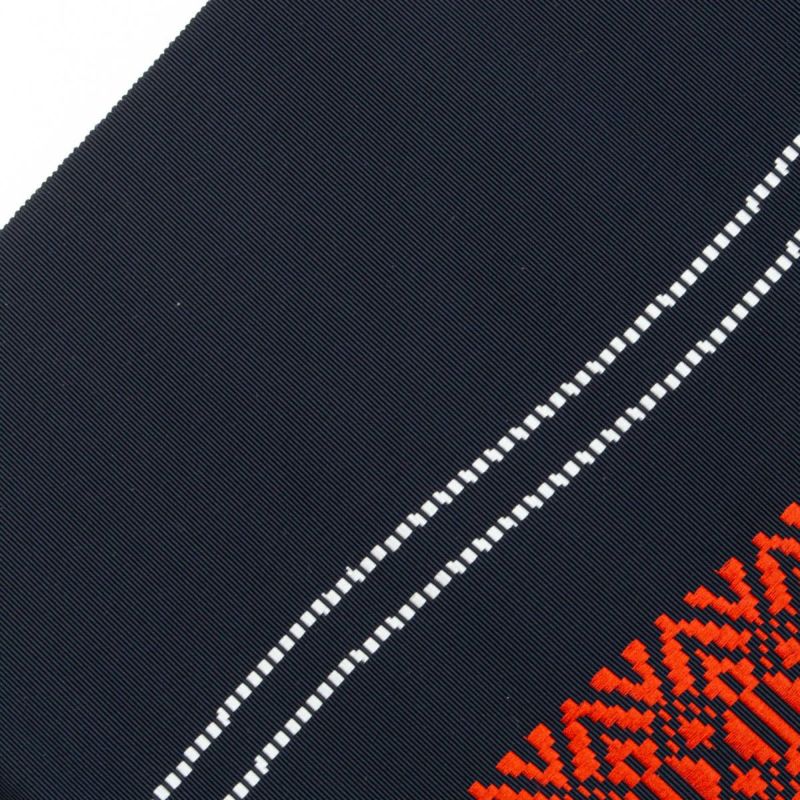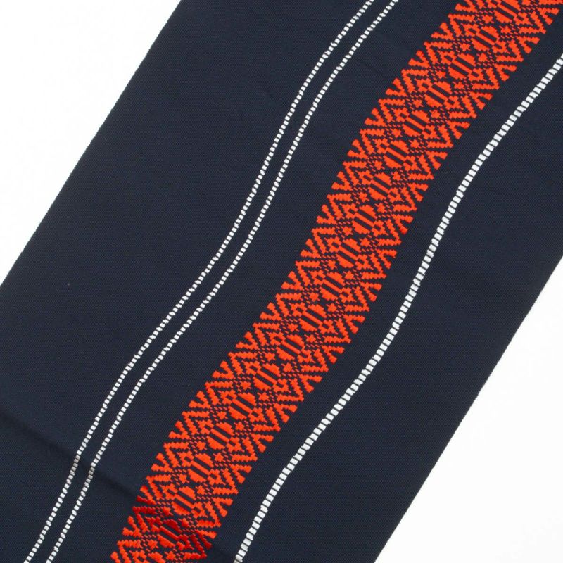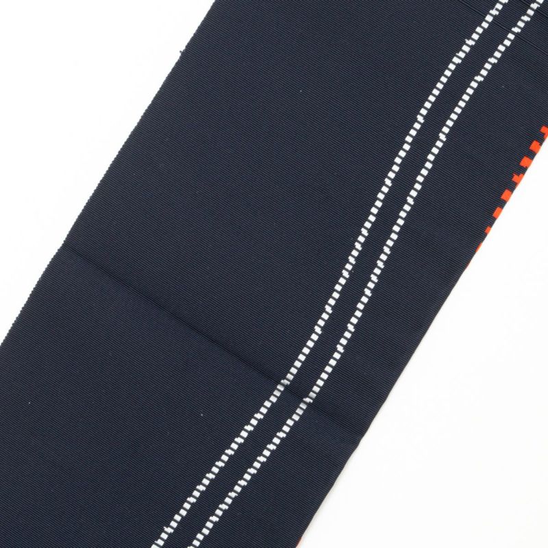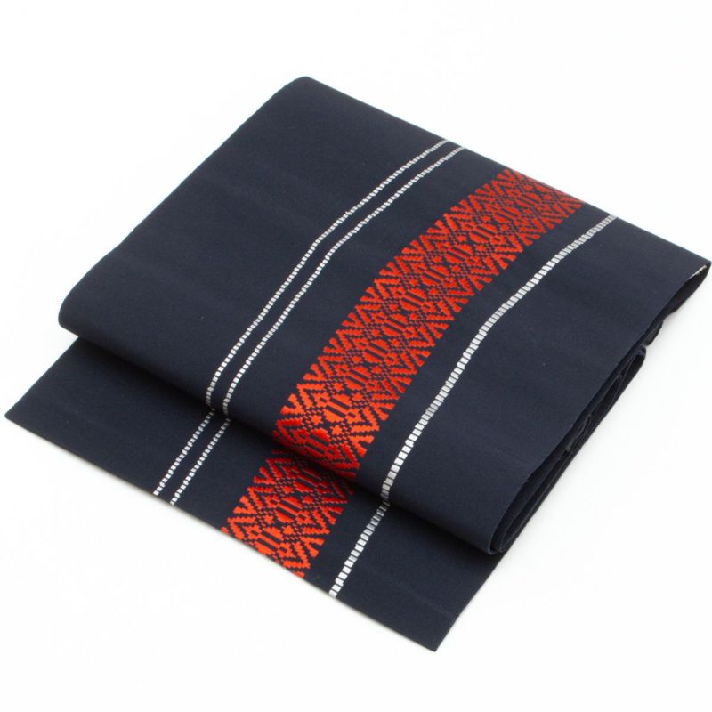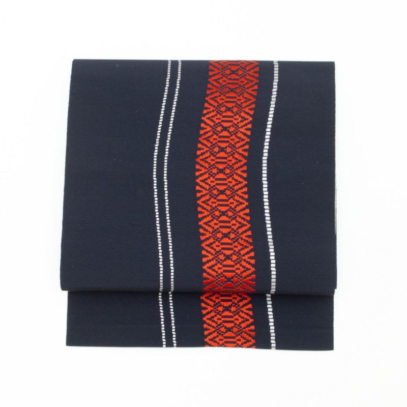【美品】名古屋帯 本場筑前 博多織 献上柄 一本独鈷 よろけ縞 濃紺 赤 白 正絹 八寸です。