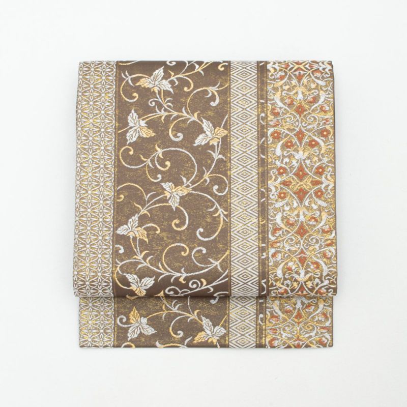 【美品】開き名古屋帯 唐草文 割付文様 縦繋ぎ 引箔 葡萄鼠 金糸 白 茶 西陣織 正絹 九寸です。