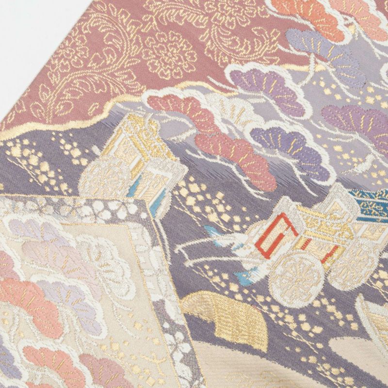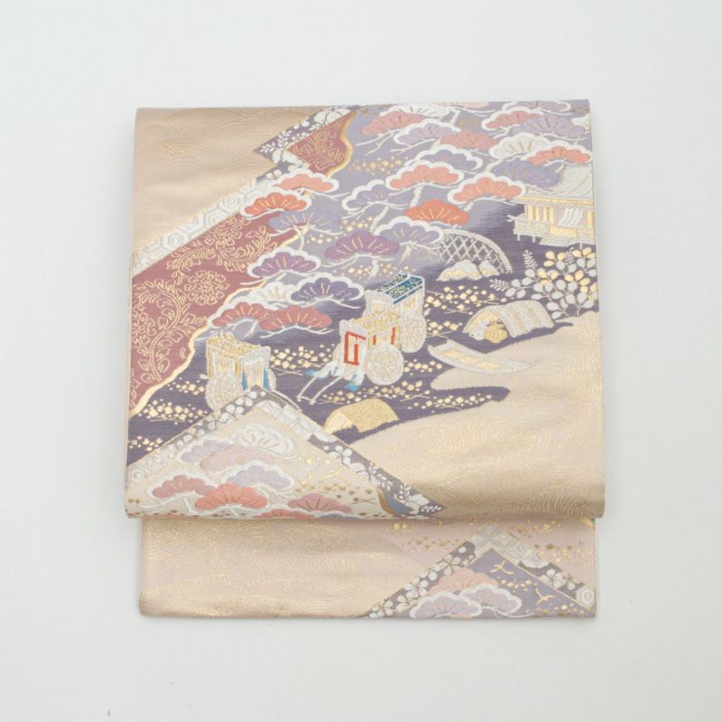 御所車や御簾、楼閣、松に霞など、雅な王朝世界を描いた御所解き文様の袋帯です。