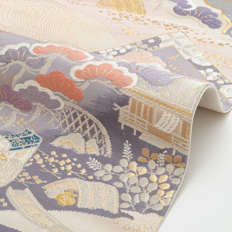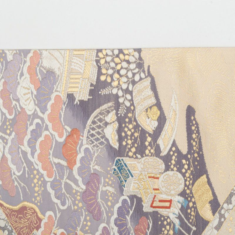 淡いライトベージュを基調に、金銀糸がふんだんに用いられ、上品な華やかさを漂わせます。