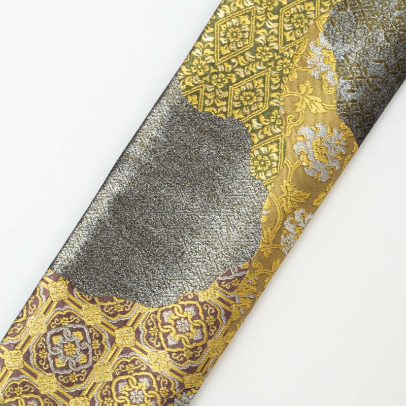 紫・黄土・金・銀など多彩な色調が調和し、装いに深みと華やぎを添える一本です。