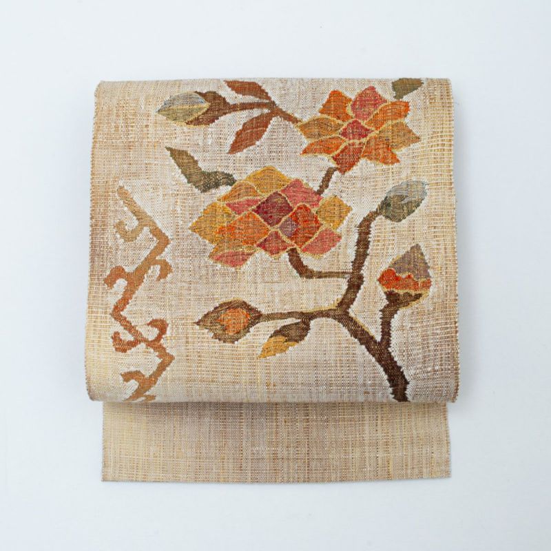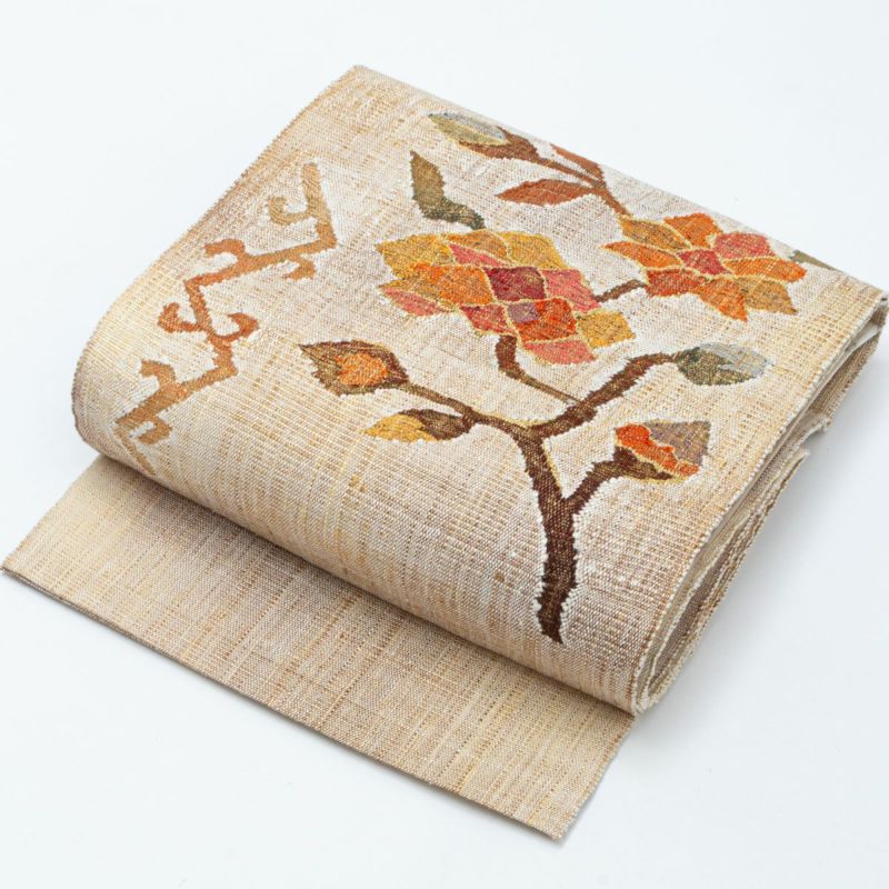 【未使用品】開き名古屋帯 真綿織 手織り ボタニカル柄 モダン 金糸入り 西陣織 正絹 八寸 です。