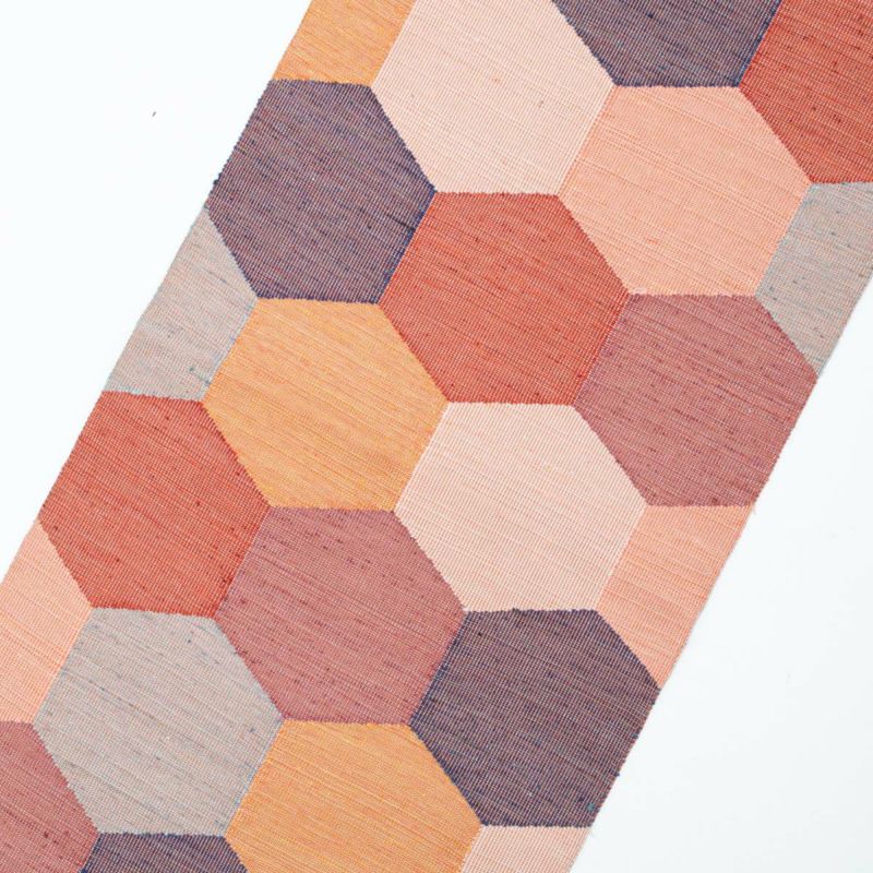 幾何学文様の中でも人気の高い「亀甲繋ぎ」を、モダンでカラフルな配色で織り上げた名古屋帯です。
