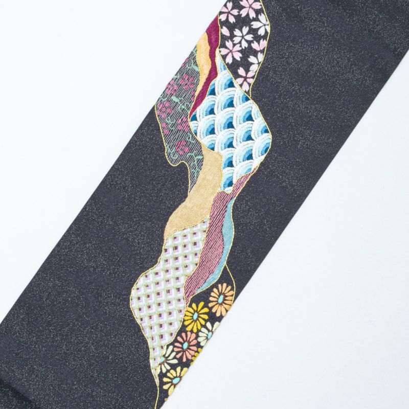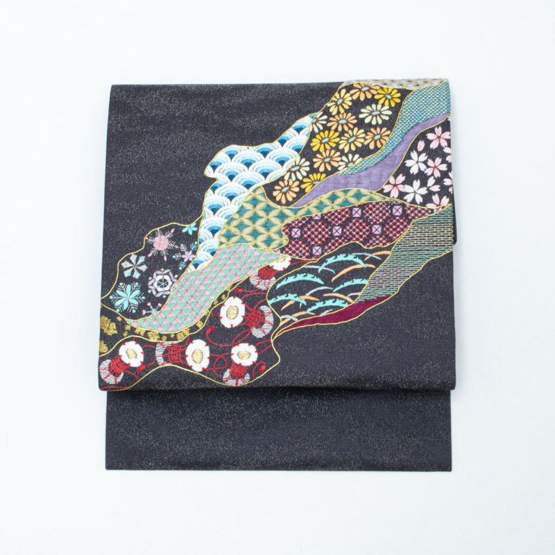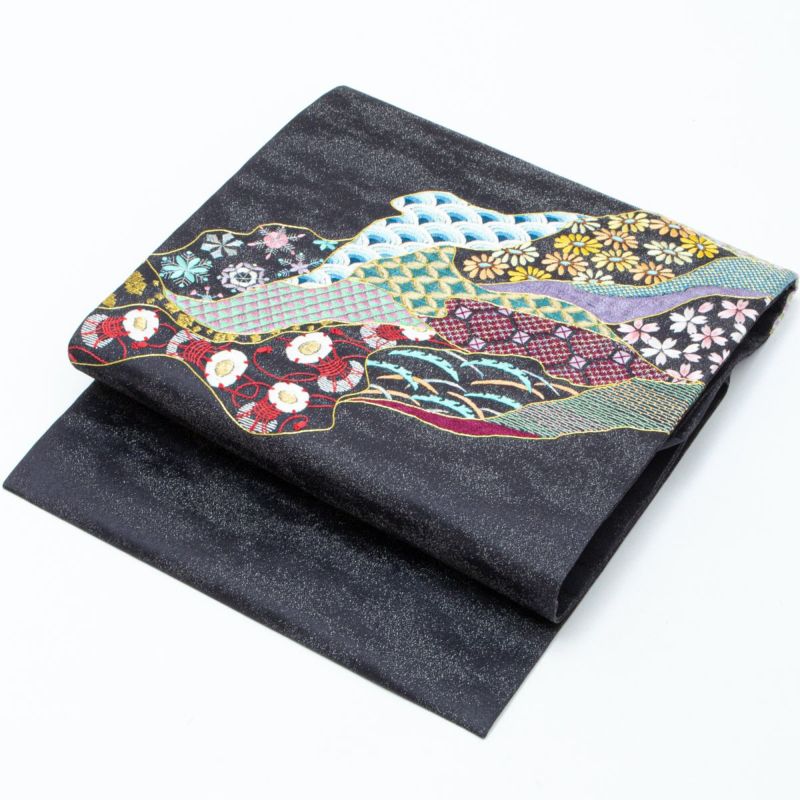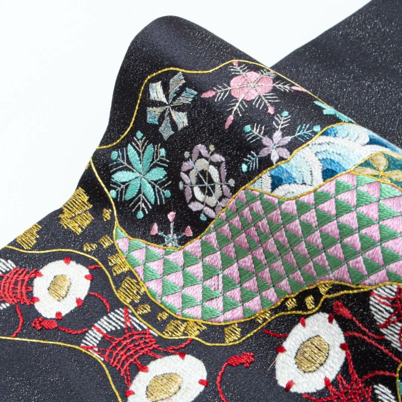お太鼓部分には、道長取りの構成の中へ、雪の結晶や太鼓の柄と、多彩な割付文様が贅沢に配され、桜・菊・青海波・麻の葉など、伝統柄が色とりどりに重なり合う華やかな仕上がりです。