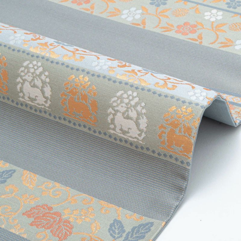 花兎や花唐草、観世水など吉祥性を帯びた意匠が品よく並び、クラシカルでありながらも軽やかな雰囲気に仕上がっています。