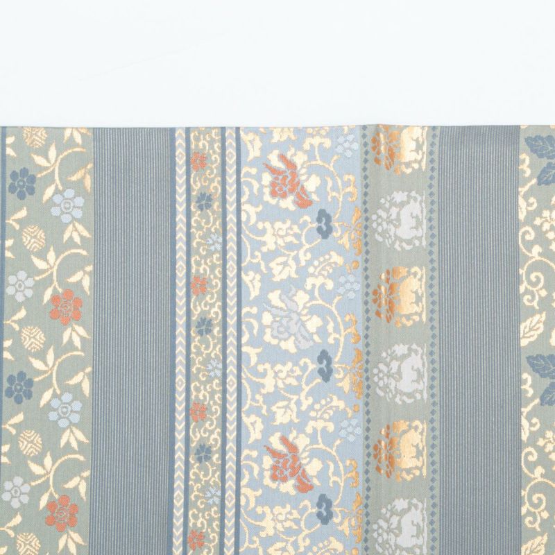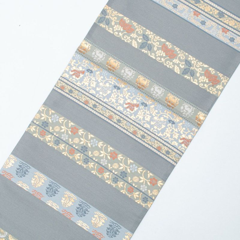 やさしいブルーグレーをベースに、金糸と淡い橙色・水色の彩りが美しいアクセントとなり、幅広い年代の方にお楽しみいただける一本です。