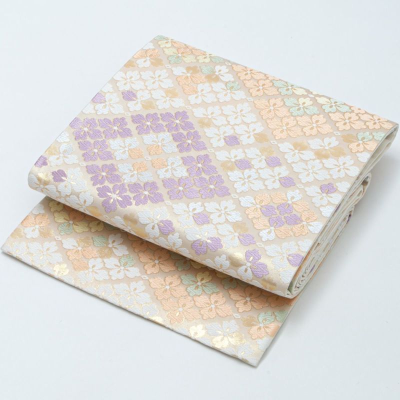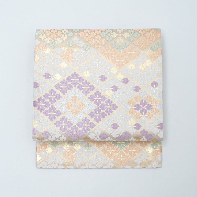 やわらかな香色を基調に、白とペールトーンの花菱繋ぎ文様が織り出された、可憐で上品な袋帯です。