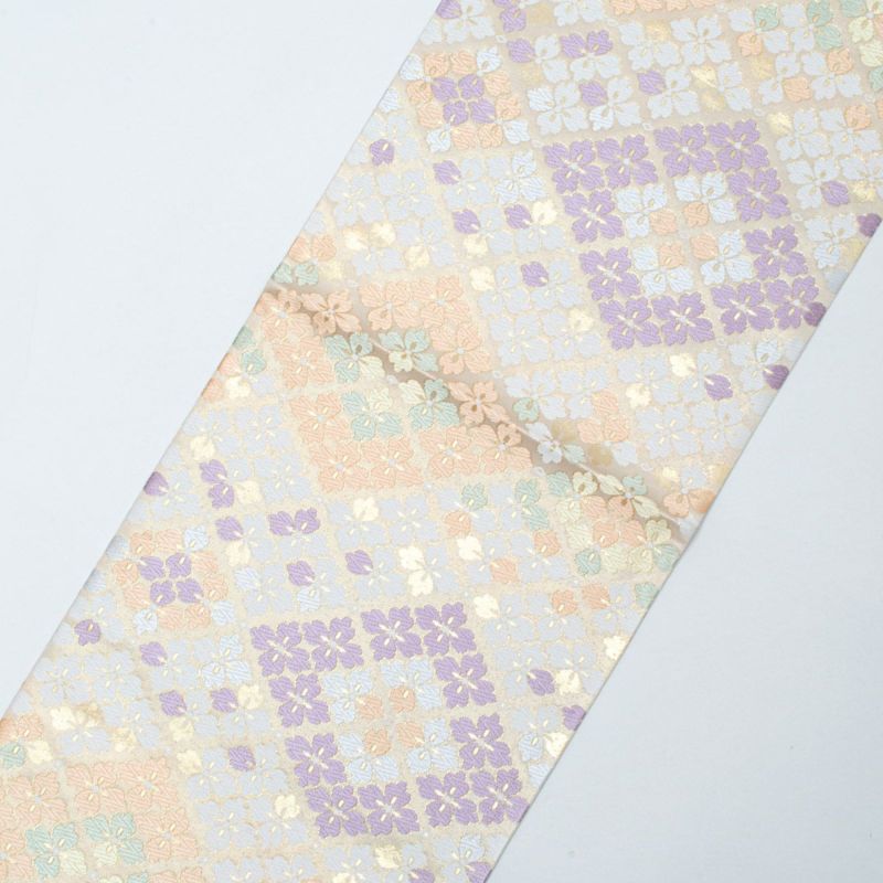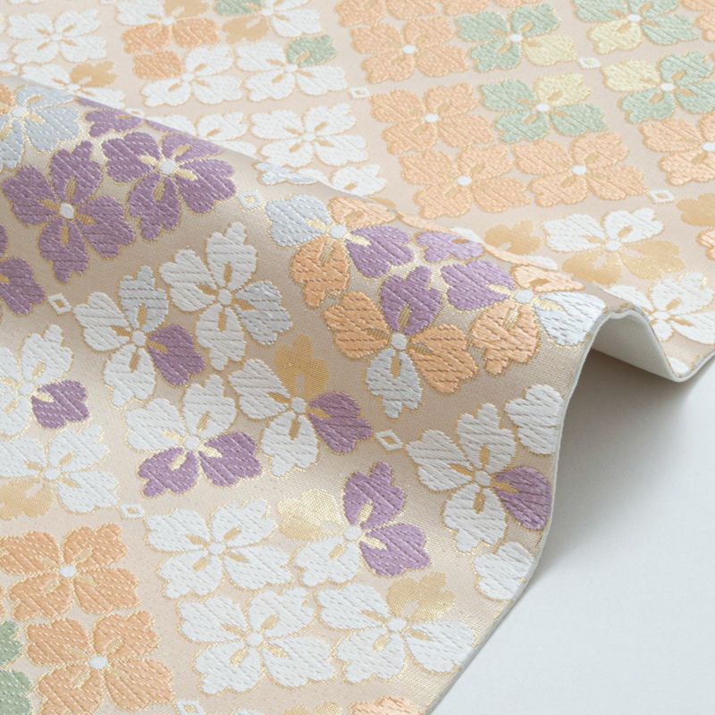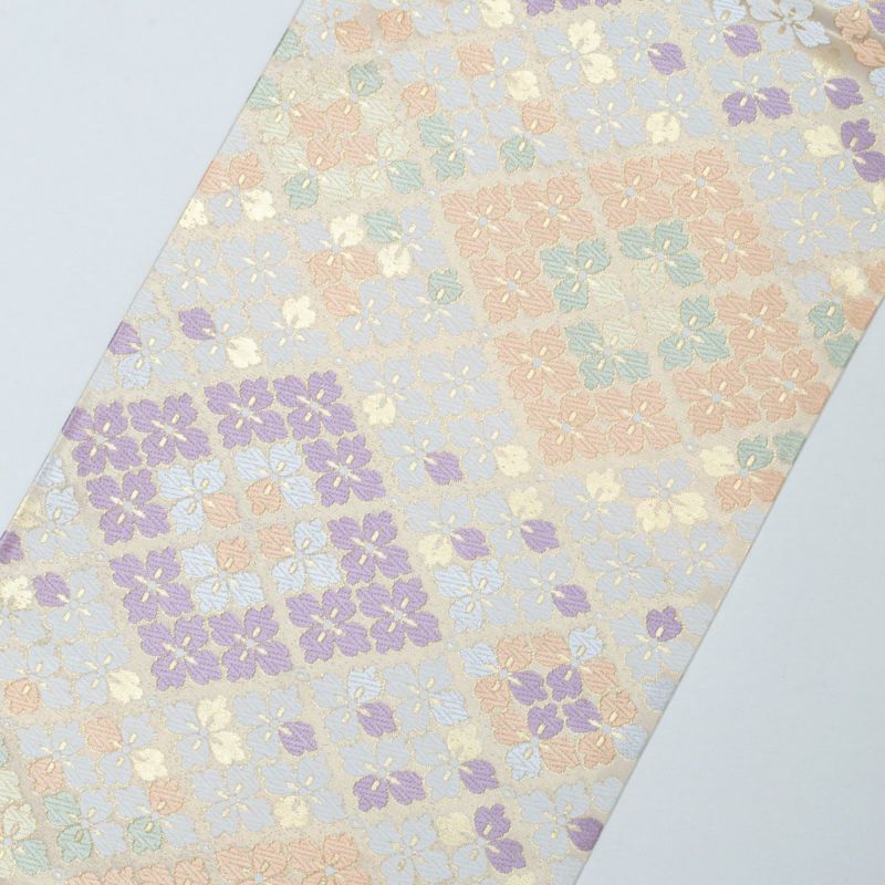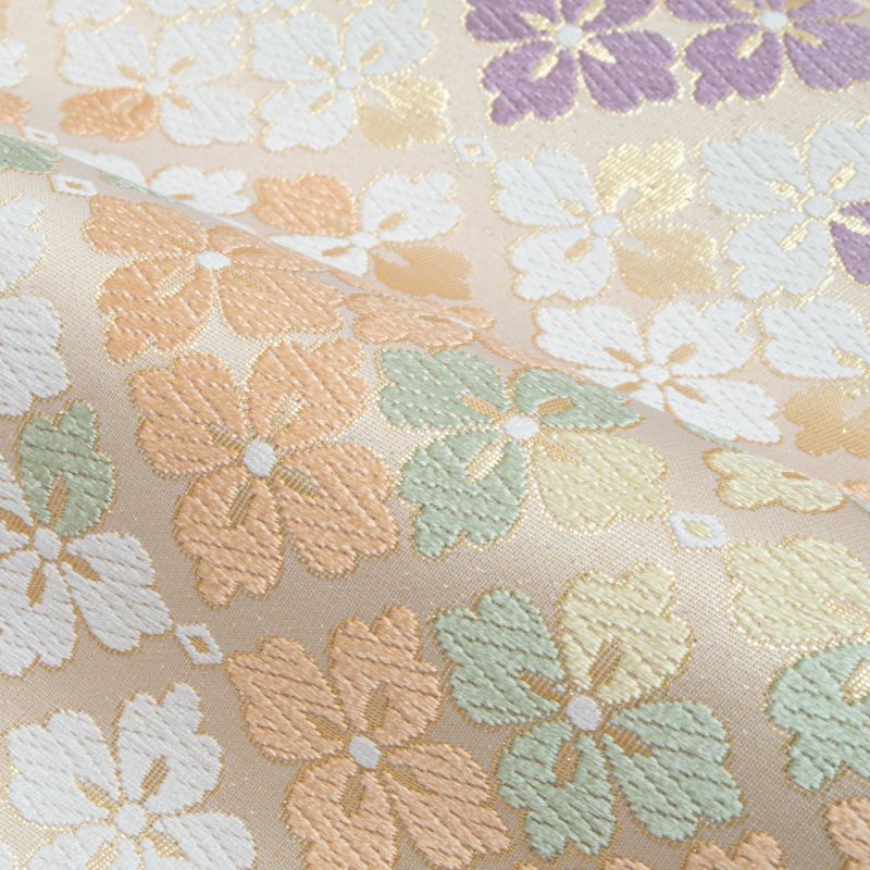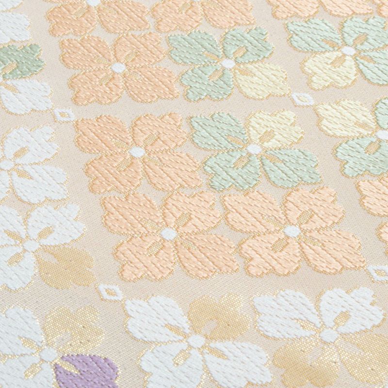 唐織ならではのふっくらとした立体感があり、淡い桜・薄紫・若葉色などを散らした、多色ながら落ち着きのある美しい彩りが魅力です。