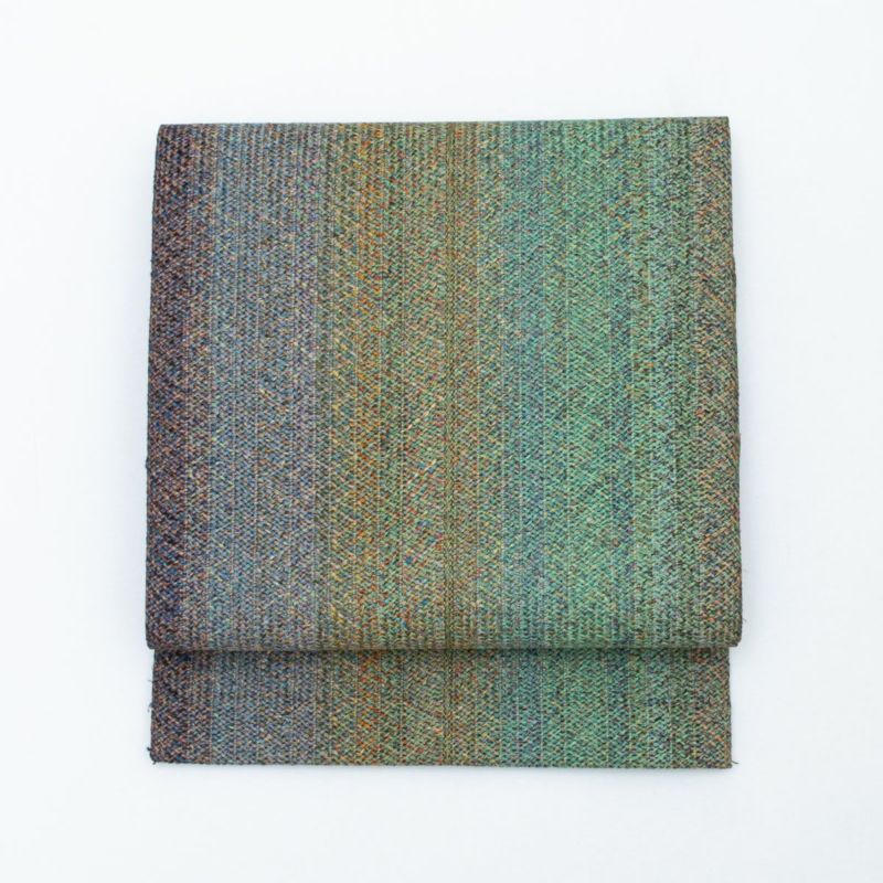 深みのあるグリーンからブルーへと流れるように変化する、美しいグラデーションが特徴の開き名古屋帯です。